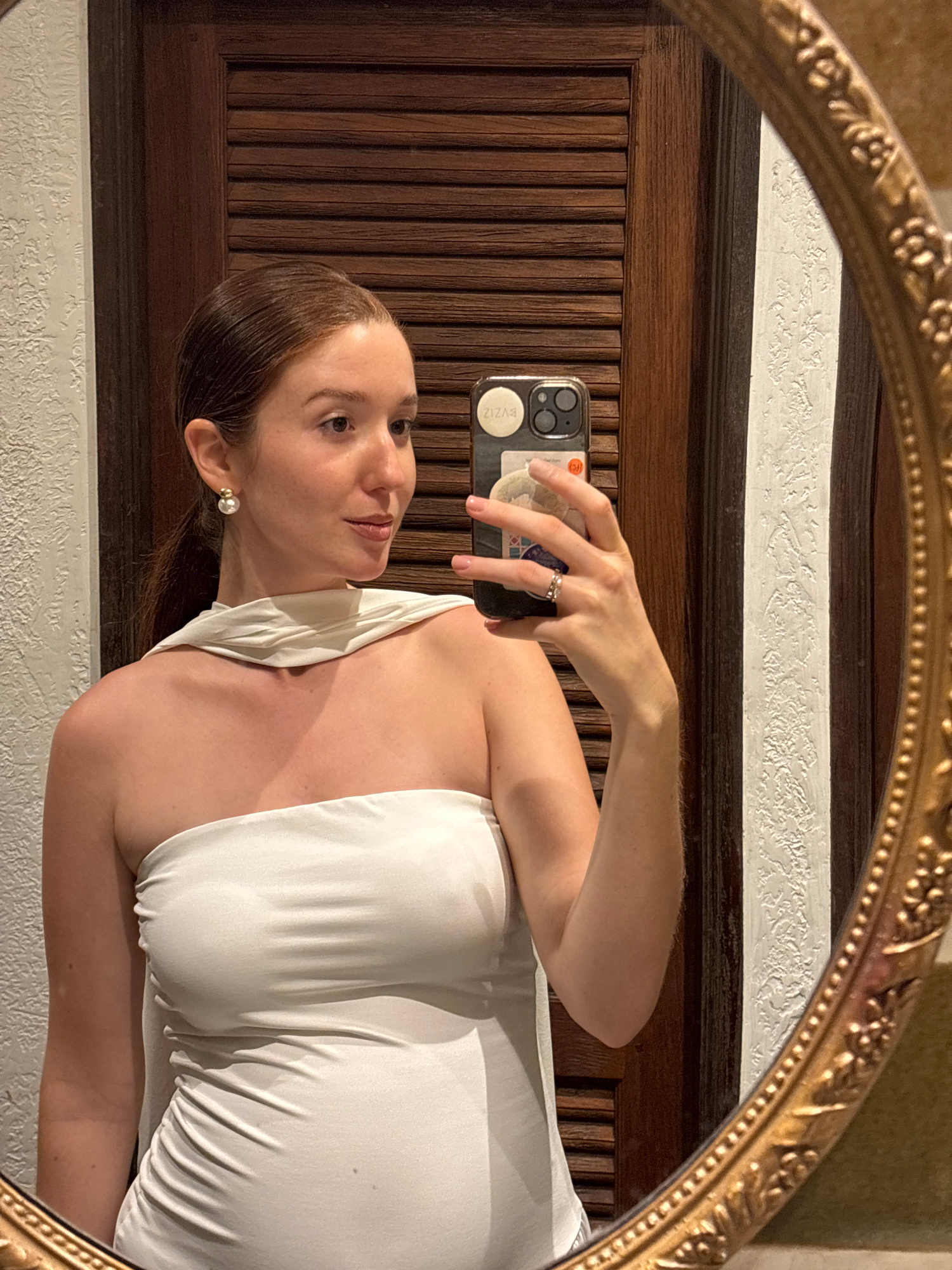 A woman is taking a selfie in a mirror. The mirror has a gold, ornate frame and reflects a wooden door with vertical slats and a white textured wall above it. The woman is wearing a white dress. She i…read more
