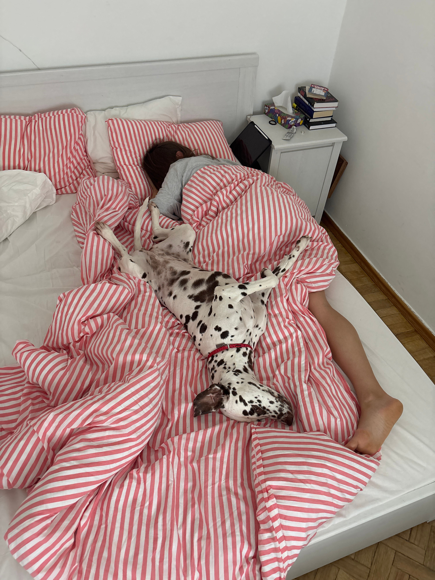 A high-angle shot depicts a person and a Dalmatian dog resting on a bed in an indoor setting. The bed is covered with white and red striped bedding. The person is positioned to the left, mostly covere…read more