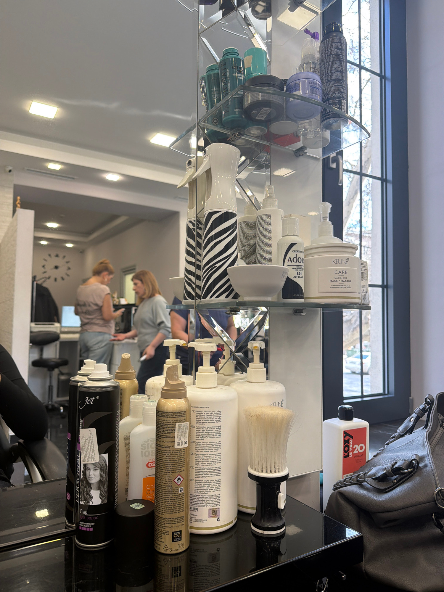 The image appears to be taken at a salon in Yerevan, Armenia. A mirrored shelf holds various haircare products including brands like "Keune," "Ador," "Jet Personal," and "Loxy 20." A gray handbag sits…read more