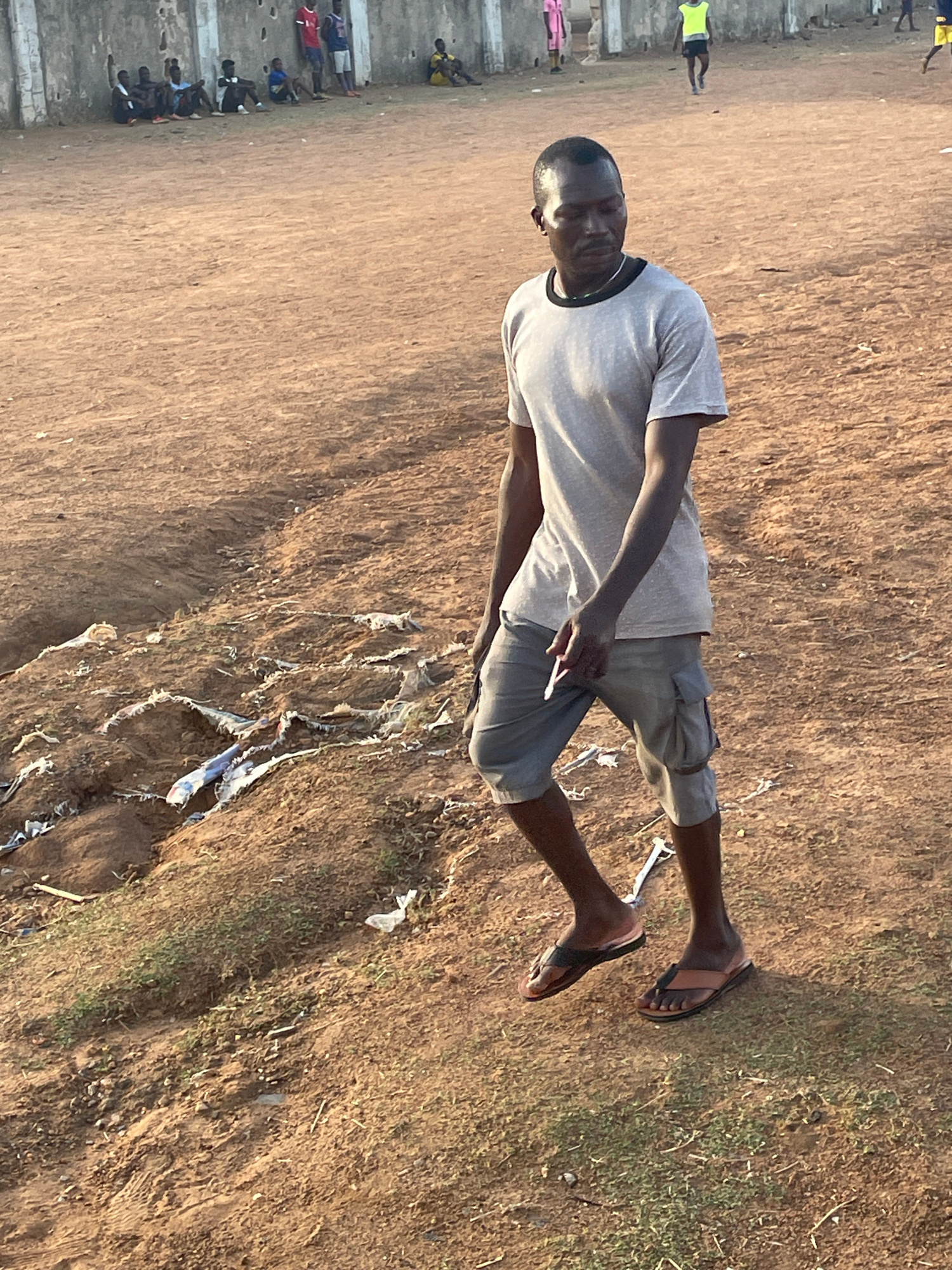 The image shows an individual standing on a dirt and grassy area adjacent to stadium seating. The person is wearing a light-colored t-shirt, gray shorts, and sandals. The ground is a mix of dirt and s…read more