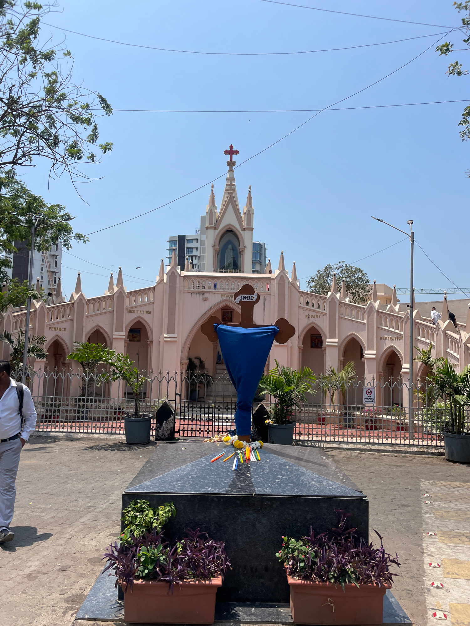The image depicts the Mount Mary Church in Mumbai, India. The church is a light pink building with arched windows and a red cross on top. In front of the church is a monument covered with a blue cloth…read more