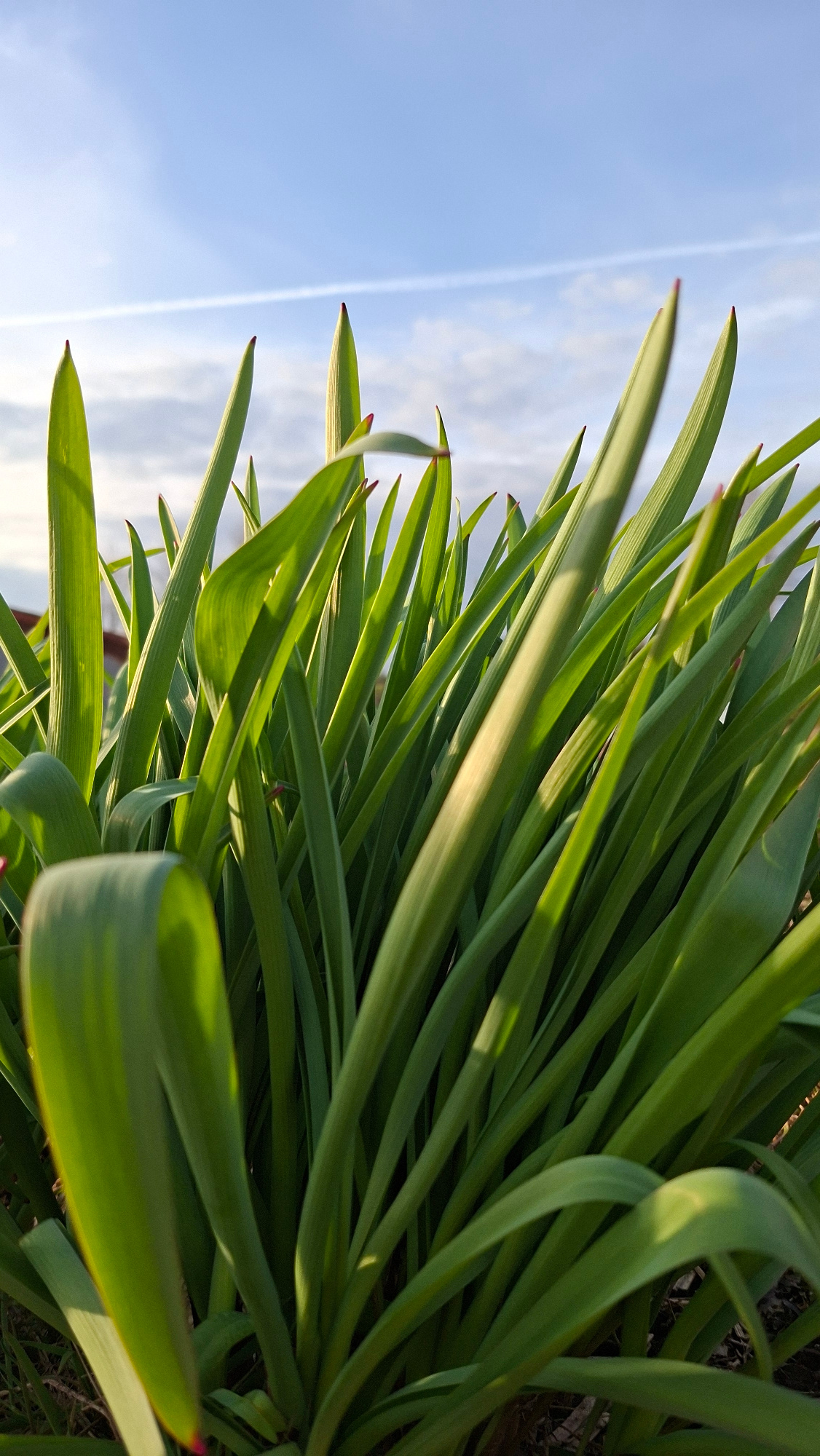 The image displays a close-up, upward-facing view of vibrant green plant foliage against a clear blue sky. The plants feature numerous long, blade-like leaves, possibly from tulips or similar bulbous…read more