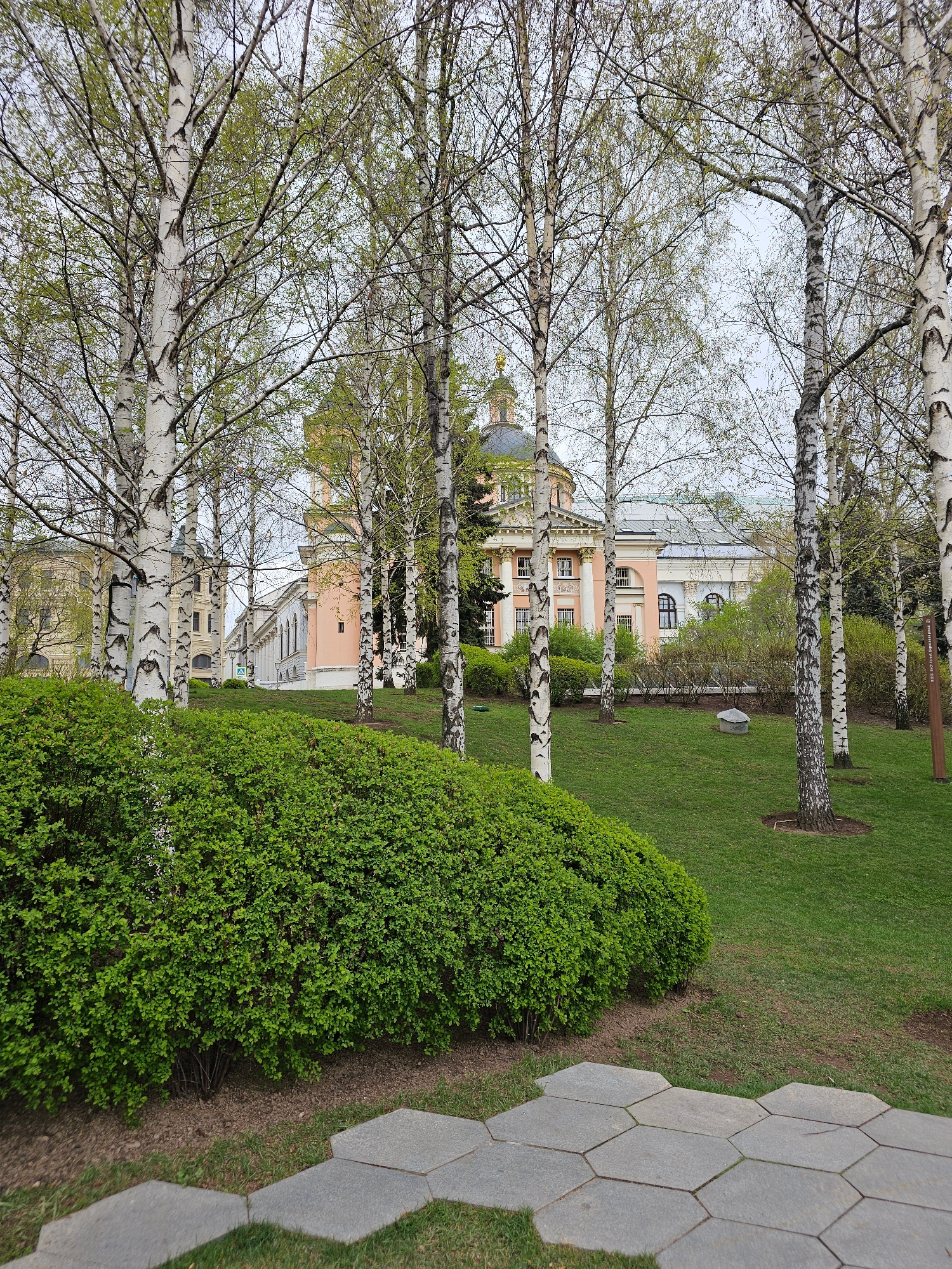 The image depicts a view through a birch tree grove in Moscow, Russia, toward a light-colored building with architectural details including a dome. The birch trees are in the foreground, their charact…read more