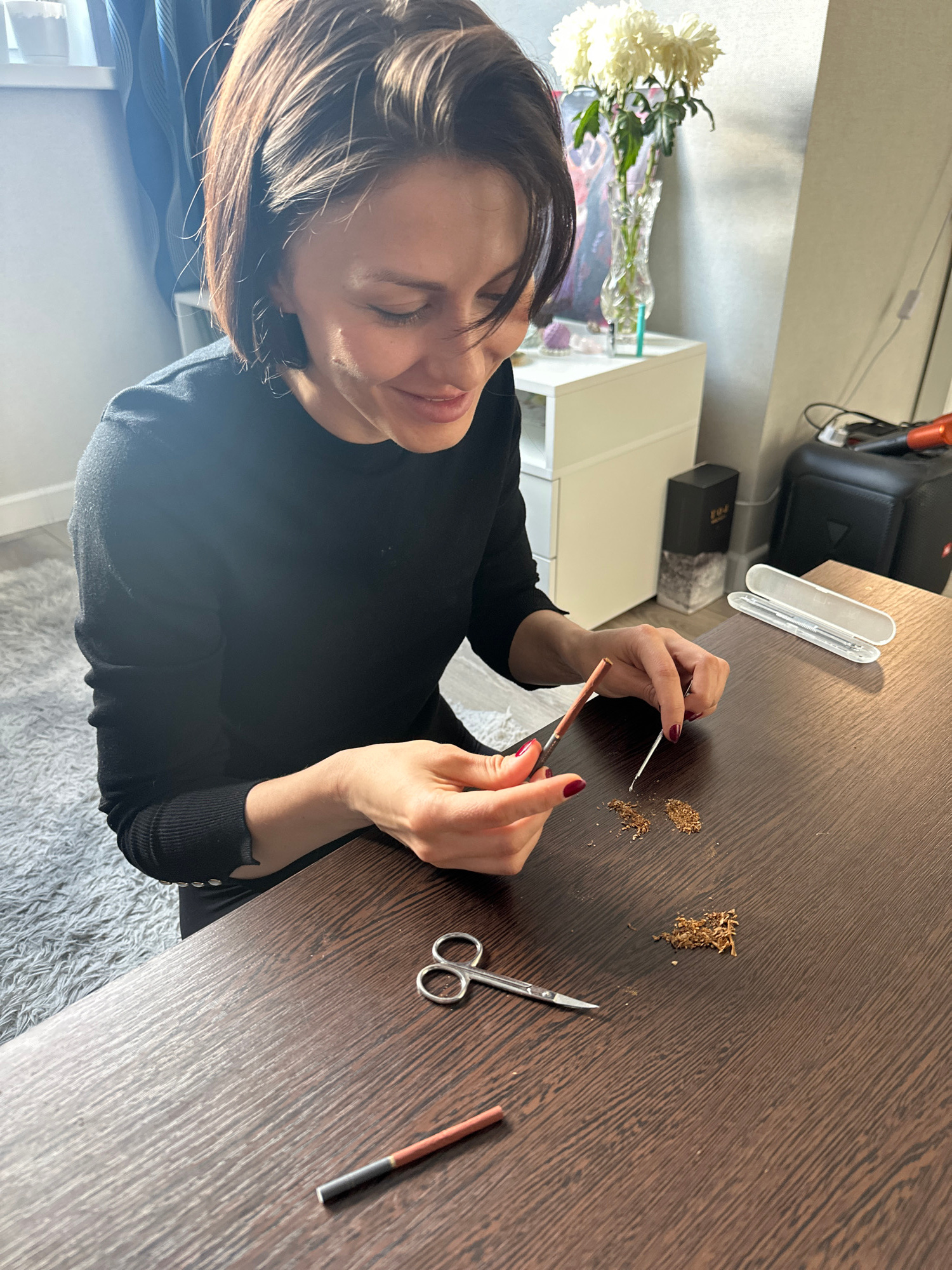 A woman sits at a dark brown wooden desk in what appears to be a domestic interior, possibly in an apartment in Murino, Russia. She is using tweezers to manipulate what appears to be loose tobacco on…read more
