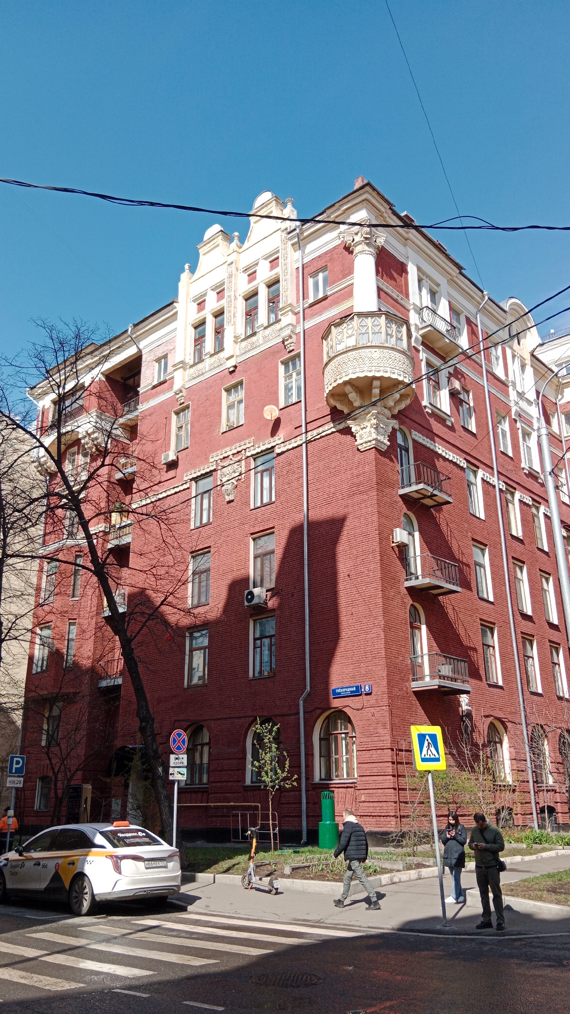 A brightly lit street corner in Moscow, Russia, features a distinctive red brick building with elaborate white architectural details under a clear blue sky. The building, likely residential, boasts a…read more