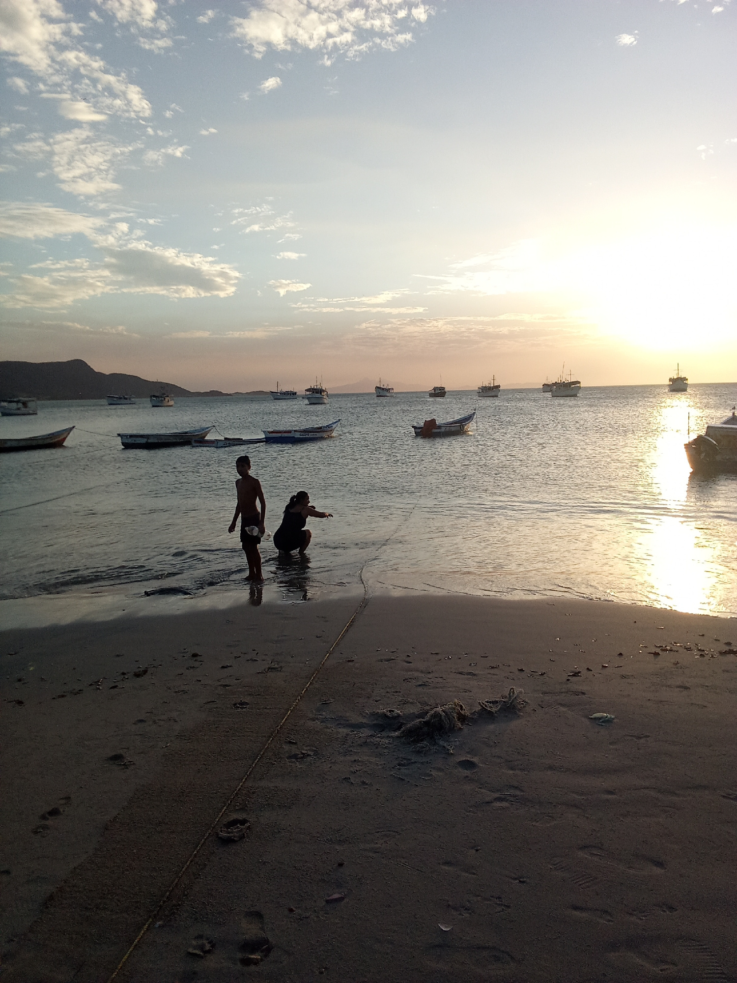 The image shows a beach scene at sunset in Juan Griego, Venezuela. The sky is filled with light clouds and a bright setting sun. Several boats are anchored in the calm water, with the silhouettes of d…read more