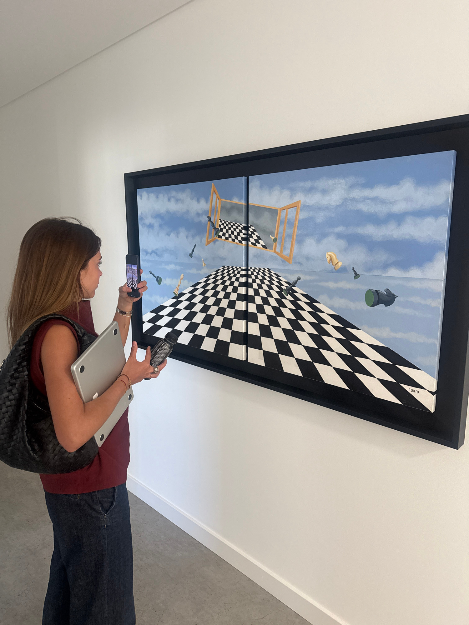 A female subject is positioned in profile, facing right, within a minimalist indoor setting, identified as an art gallery or exhibition in Torres Vedras, Portugal. She has long brown hair and wears a…read more