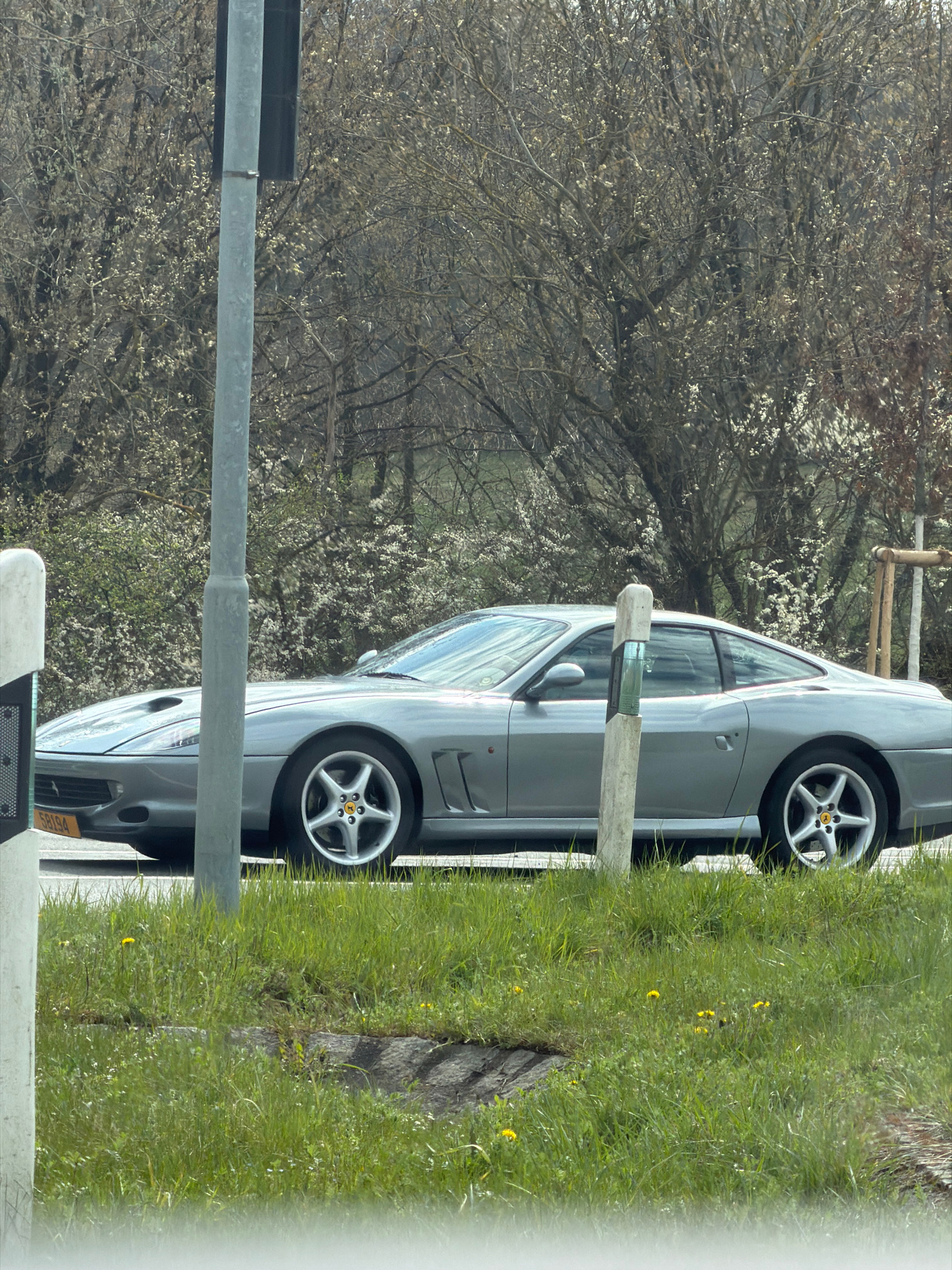The image depicts a silver Ferrari parked beside a road with grassy verges in Luxembourg City, Luxembourg. The background includes trees in bloom and an overcast sky. A section of a metal guardrail is…read more