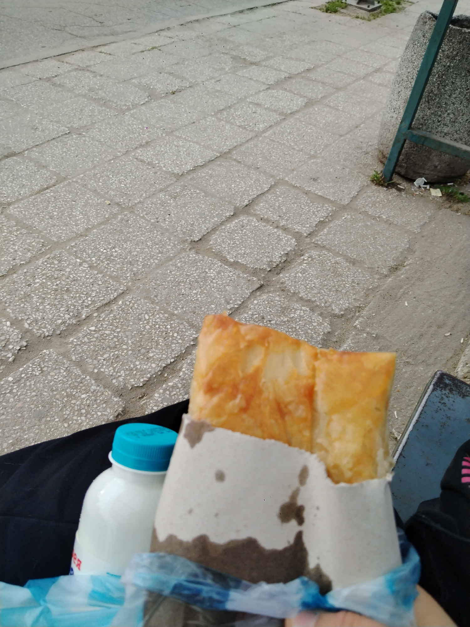 The image depicts a person holding a piece of burek (a baked filled pastry) in a paper wrapper and a bottle of what appears to be yogurt or milk. They are likely sitting outdoors, as the background sh…read more