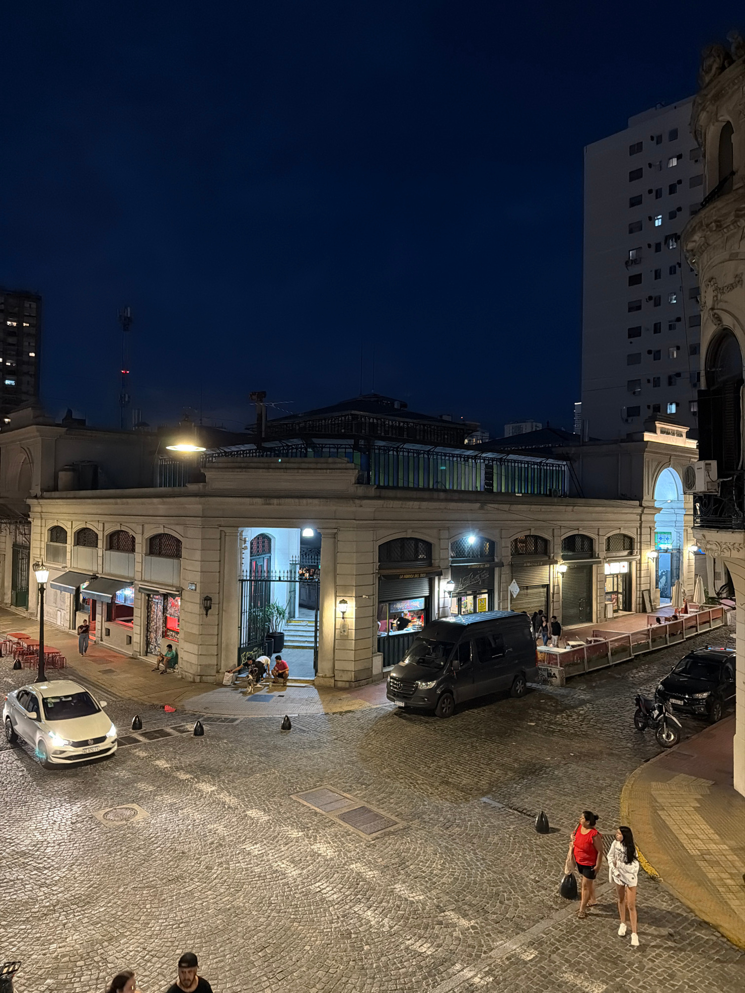 This is an outdoor scene taken at night in what appears to be a European-style street in Buenos Aires, Argentina. The street is paved with cobblestones. Buildings line the left side of the street, ill…read more