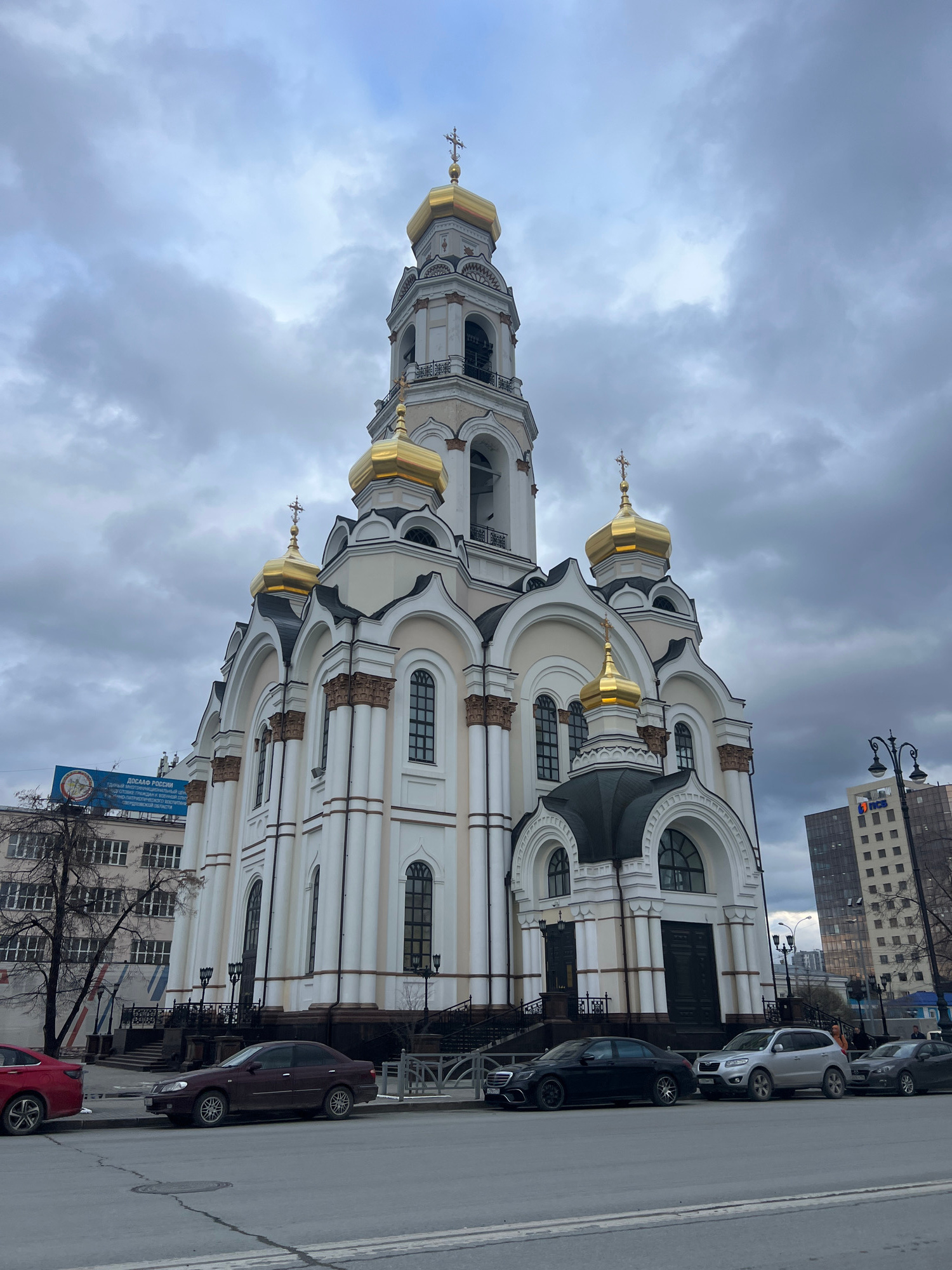 The image shows the Church on Blood in Yekaterinburg, Russia. The church is white with golden domes. The sky is overcast. Cars are parked along the street. Buildings are visible in the background.
