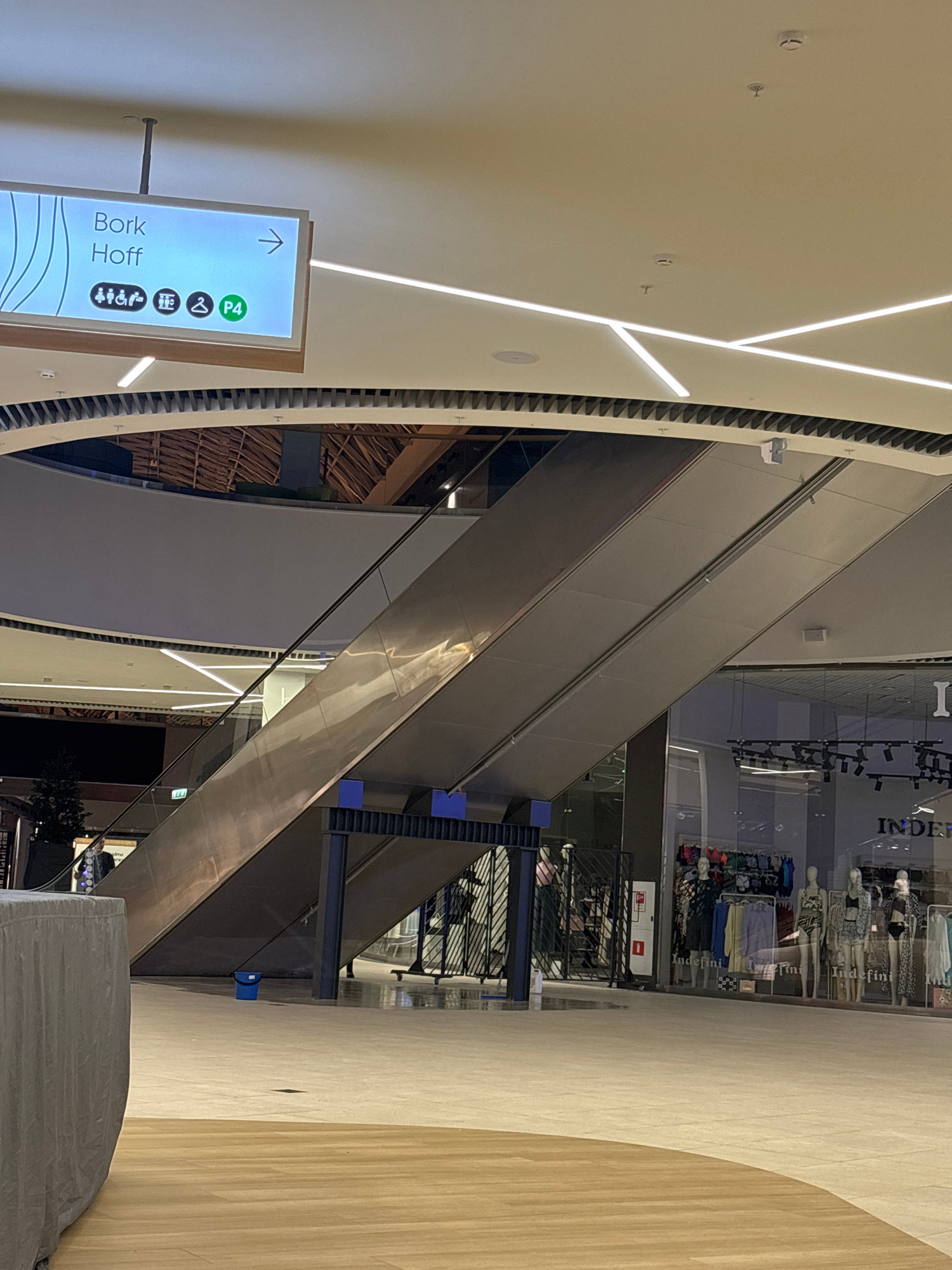The image depicts the interior of a shopping mall. An escalator ascends from the bottom left towards the upper right. Next to the escalator is a sign indicating "Bork Hoff" and directions. A retail st…read more