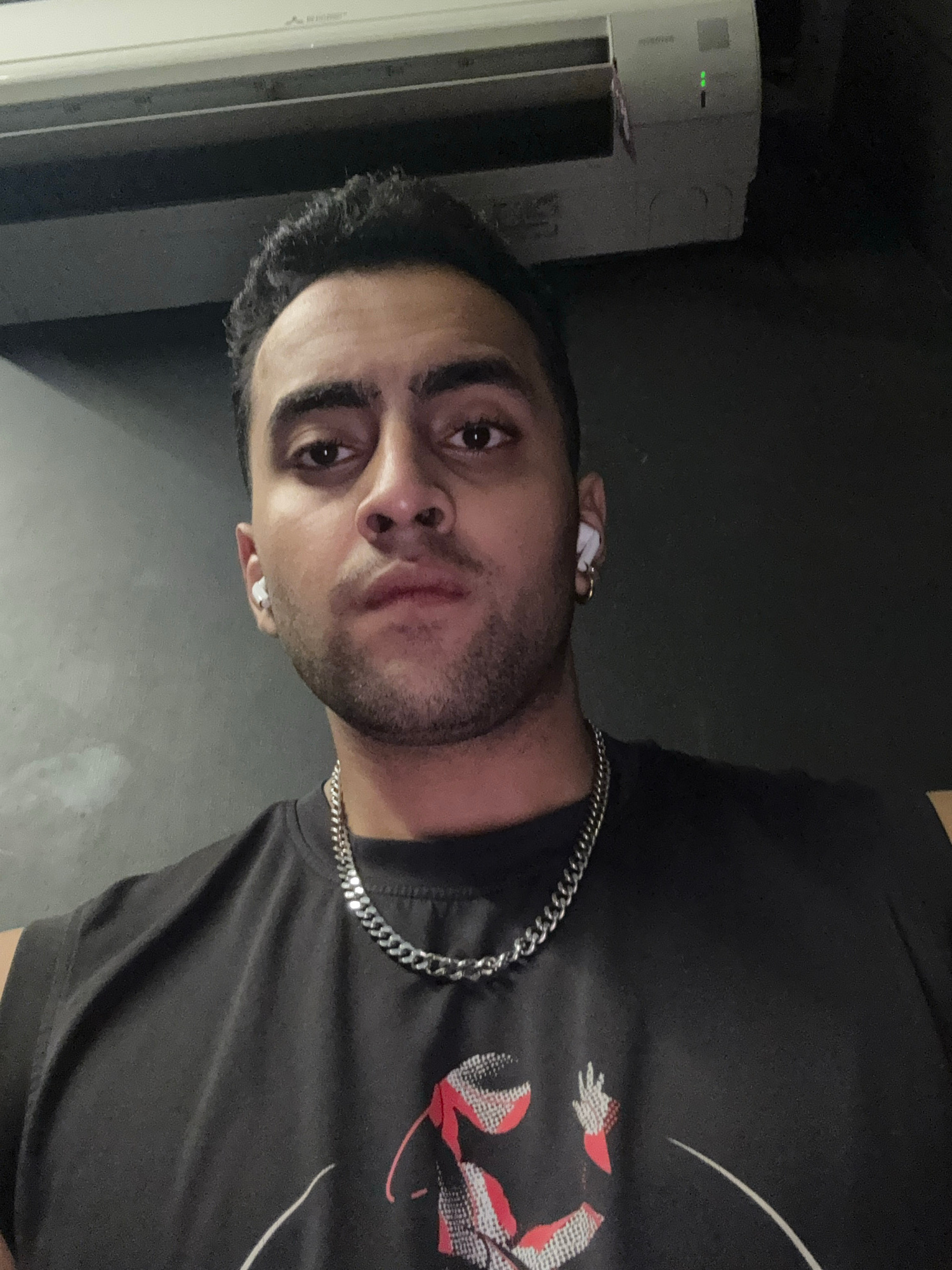 A young man with short dark hair and a trimmed beard is photographed indoors against a dark background. He is wearing a dark T-shirt with a graphic design on the right shoulder and a silver chain arouβ¦read more
