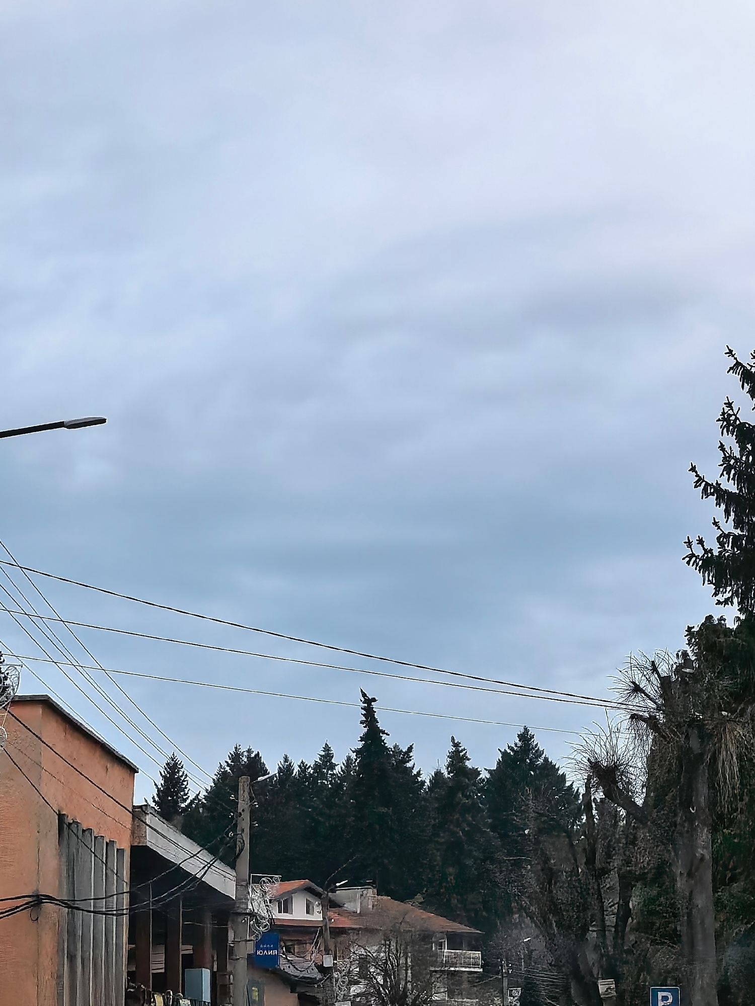 The image depicts a street scene in an urban environment, possibly a residential area. In the foreground, there is a light post on the left side, power lines running across the frame, and parts of bui…read more