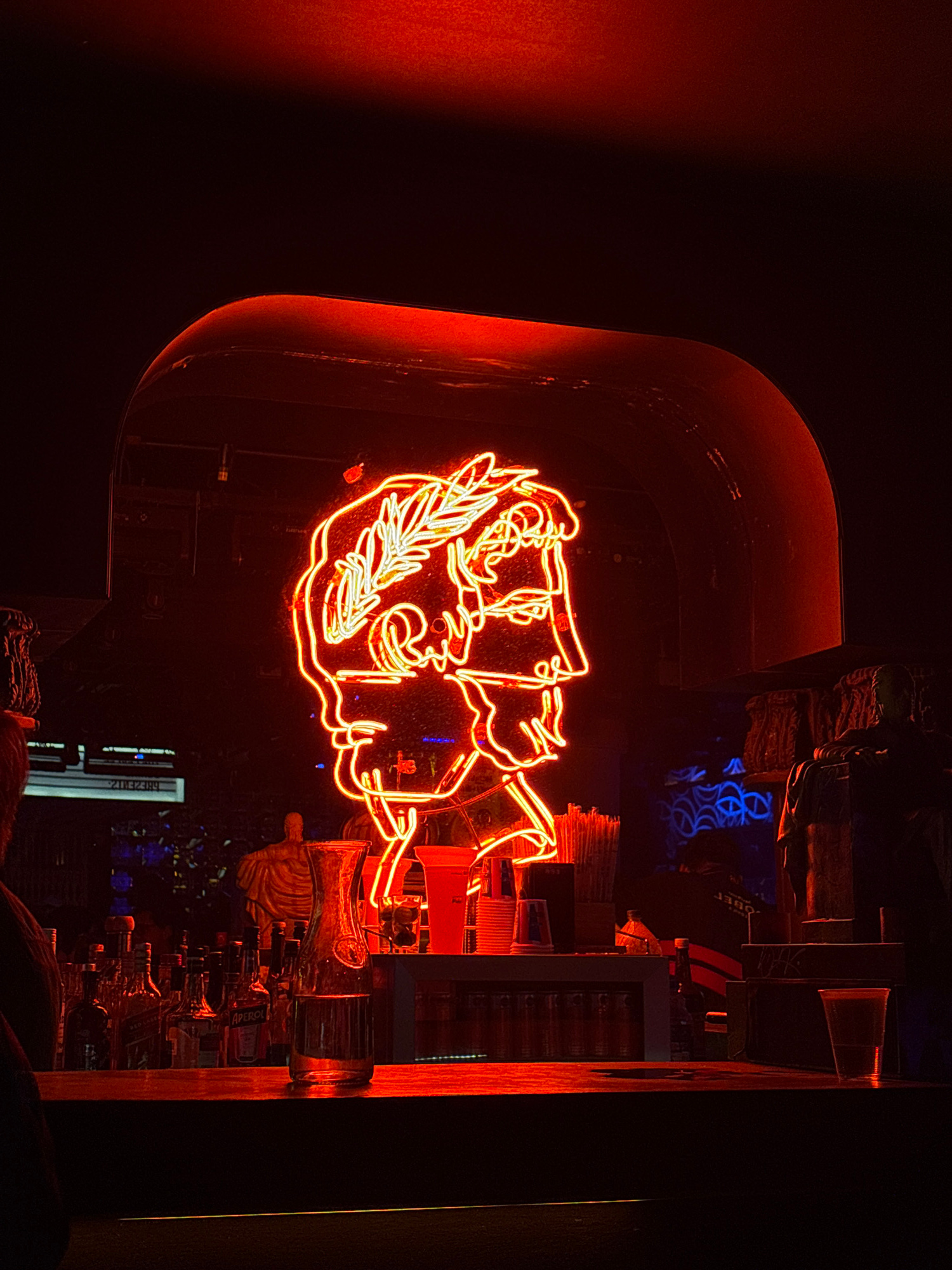 The image displays an interior scene within a bar or club in San Bernardino Tlaxcalancingo, Mexico, under dark, predominantly red lighting conditions. A prominent, bright red and yellow neon sign in t…read more