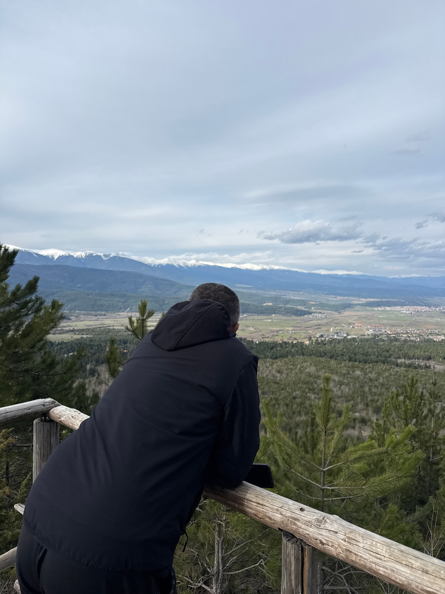 A man in a dark jacket is seen from behind, leaning against a wooden railing and looking out at a vista. The view encompasses a valley with patches of green fields and forests, stretching toward a tow…read more