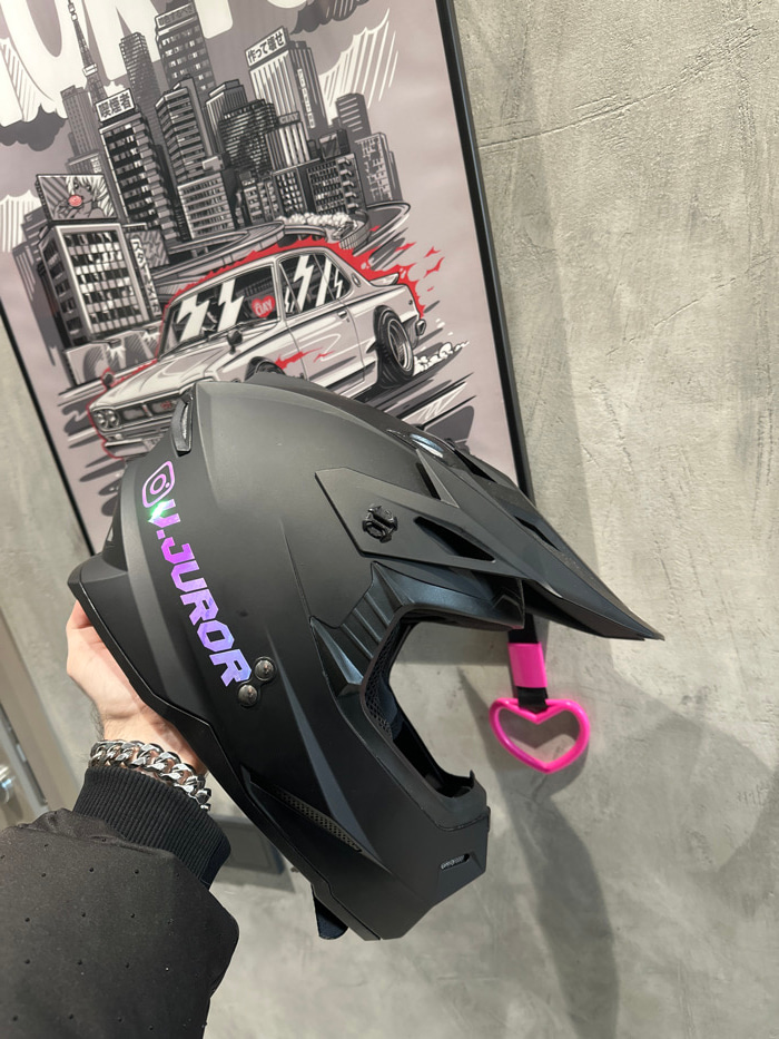 The scene depicts an interior view in Khimki, Russia, featuring a matte black full-face off-road helmet held by a left human hand. The hand is covered by a dark long-sleeved garment and adorned with a…read more