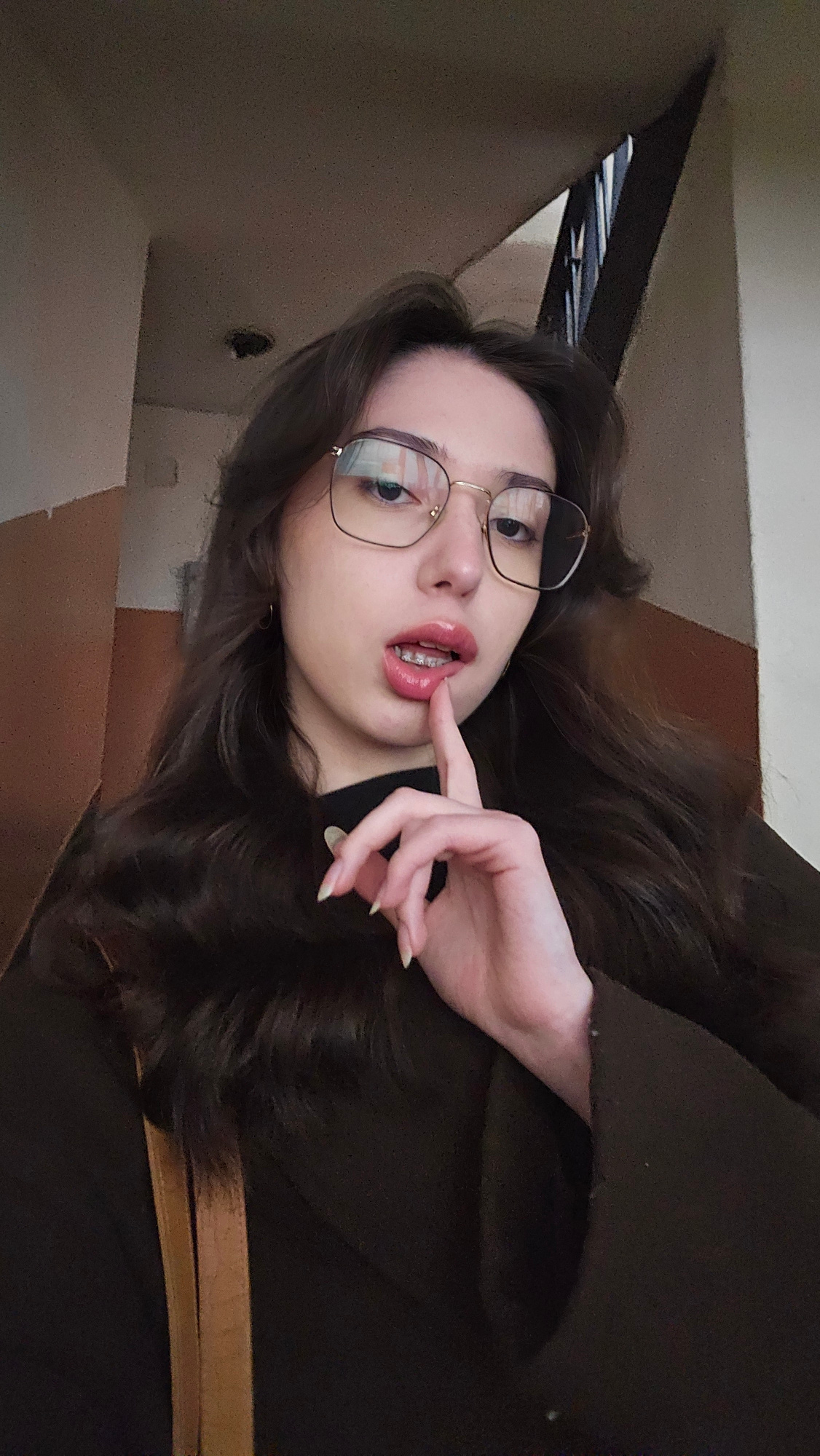 A young woman with long brown hair, wearing glasses and dark clothing, is positioned in the foreground. Her left hand is raised near her mouth, with her index finger touching her lips. She appears to…read more