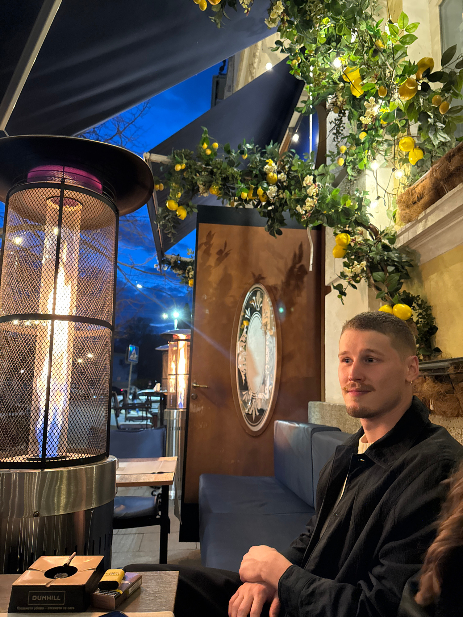 The image depicts an outdoor or semi-enclosed patio area of an establishment, observed during dusk or early night. In the mid-right, a Caucasian male with short brown hair and a mustache, wearing a da…read more