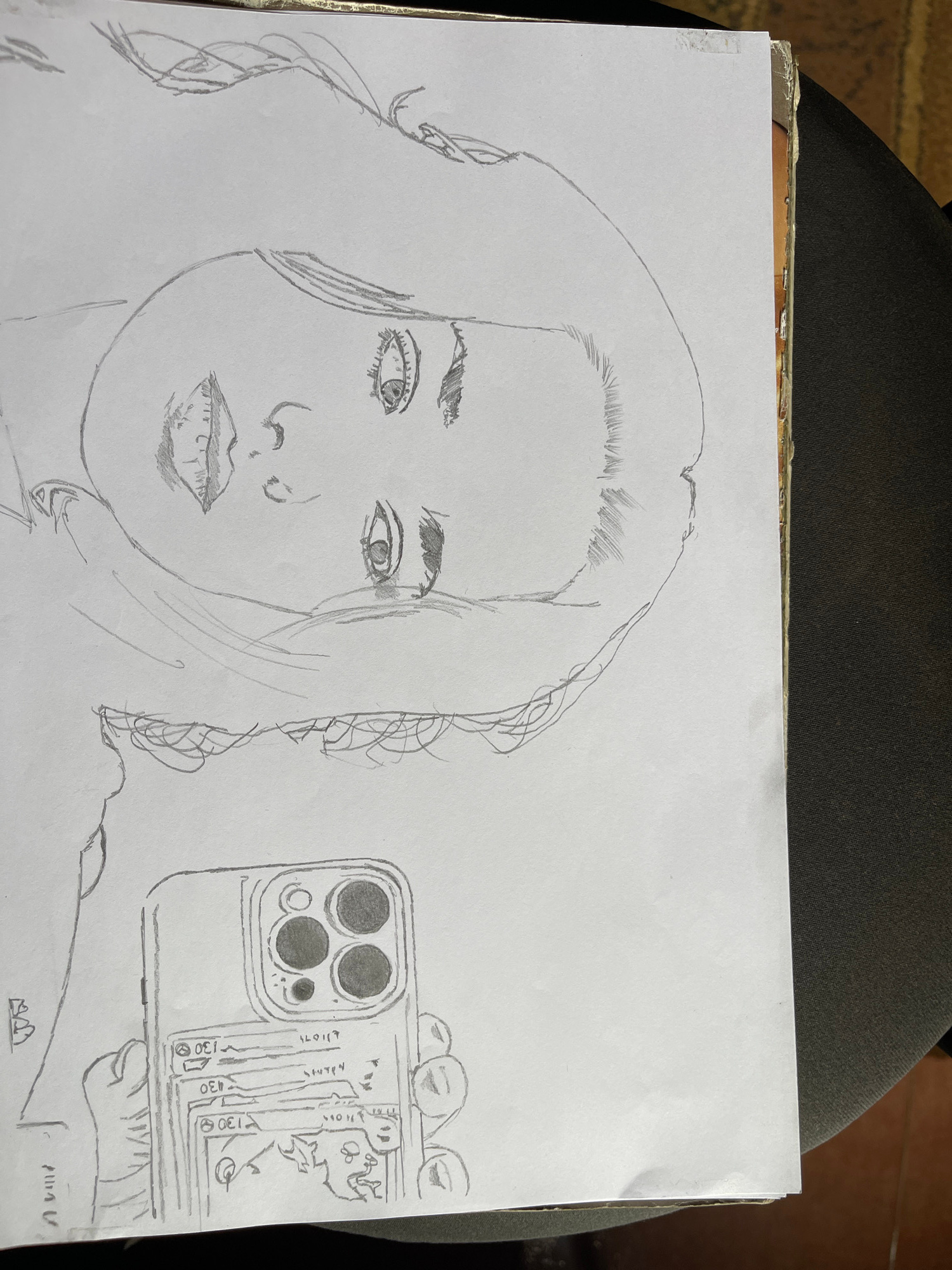 The image shows a pencil drawing of a person taking a selfie with a phone. The subject is a person with shoulder-length hair. The phone has multiple camera lenses and writing and drawings on the back.…read more