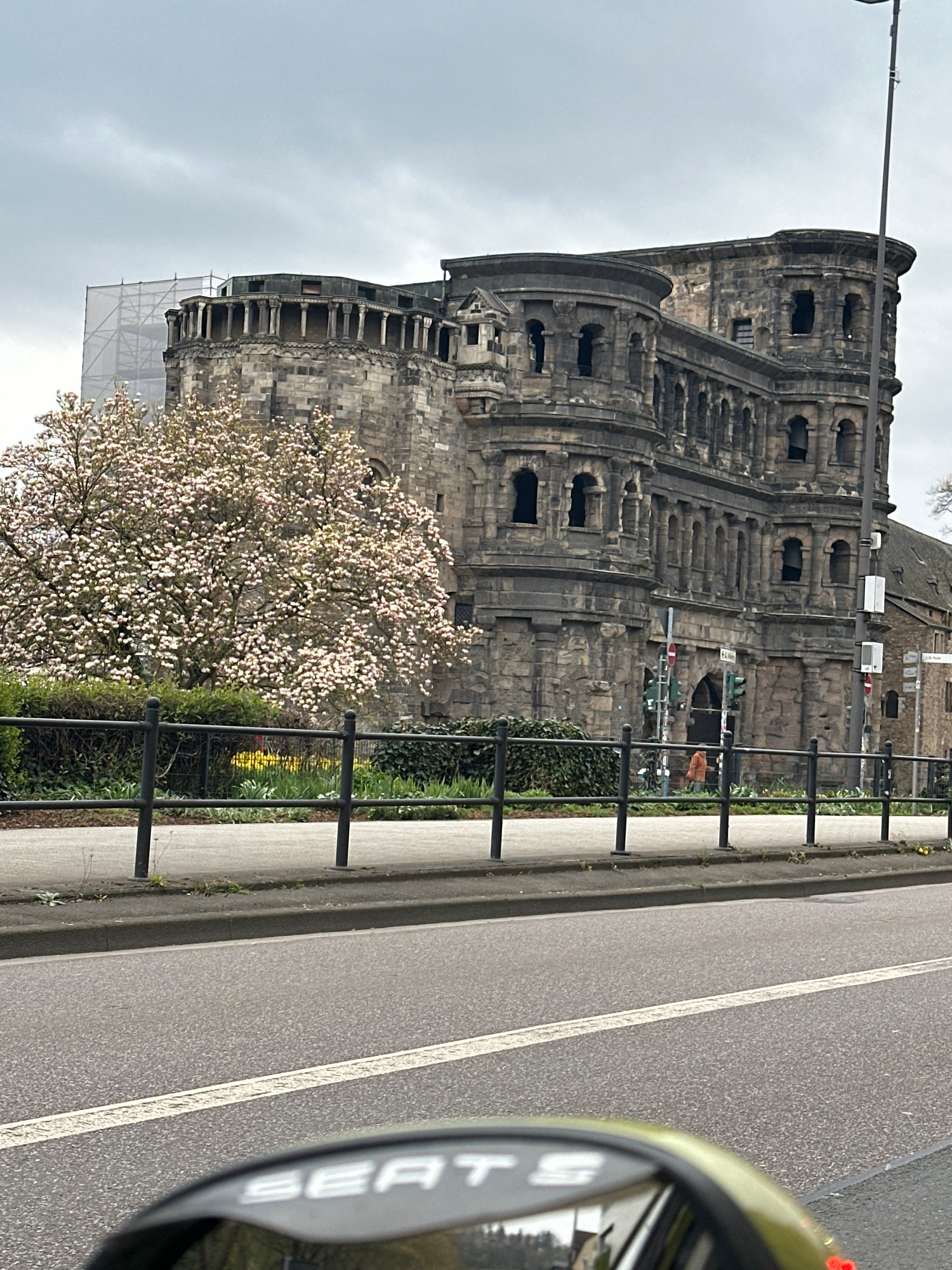 The image captures a street scene in Trier, Germany, featuring the Porta Nigra, a large Roman city gate. The ancient stone structure of the Porta Nigra dominates the left side of the frame, showcasing…read more