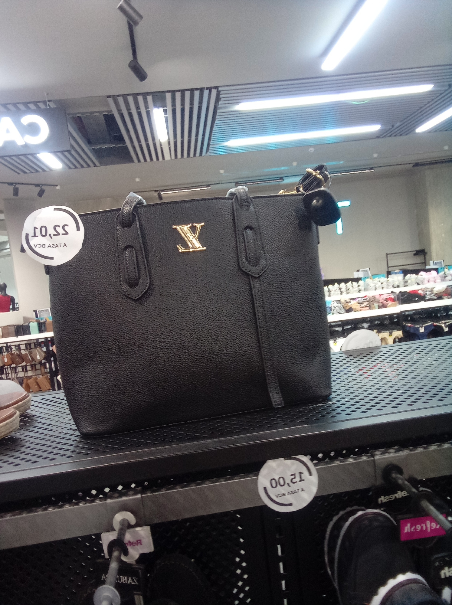 The image shows a black purse with a gold "Y" emblem on a metal shelf in a store. A white circular price tag with the price "10,55" is attached to the purse. Another white circular price tag with the…read more