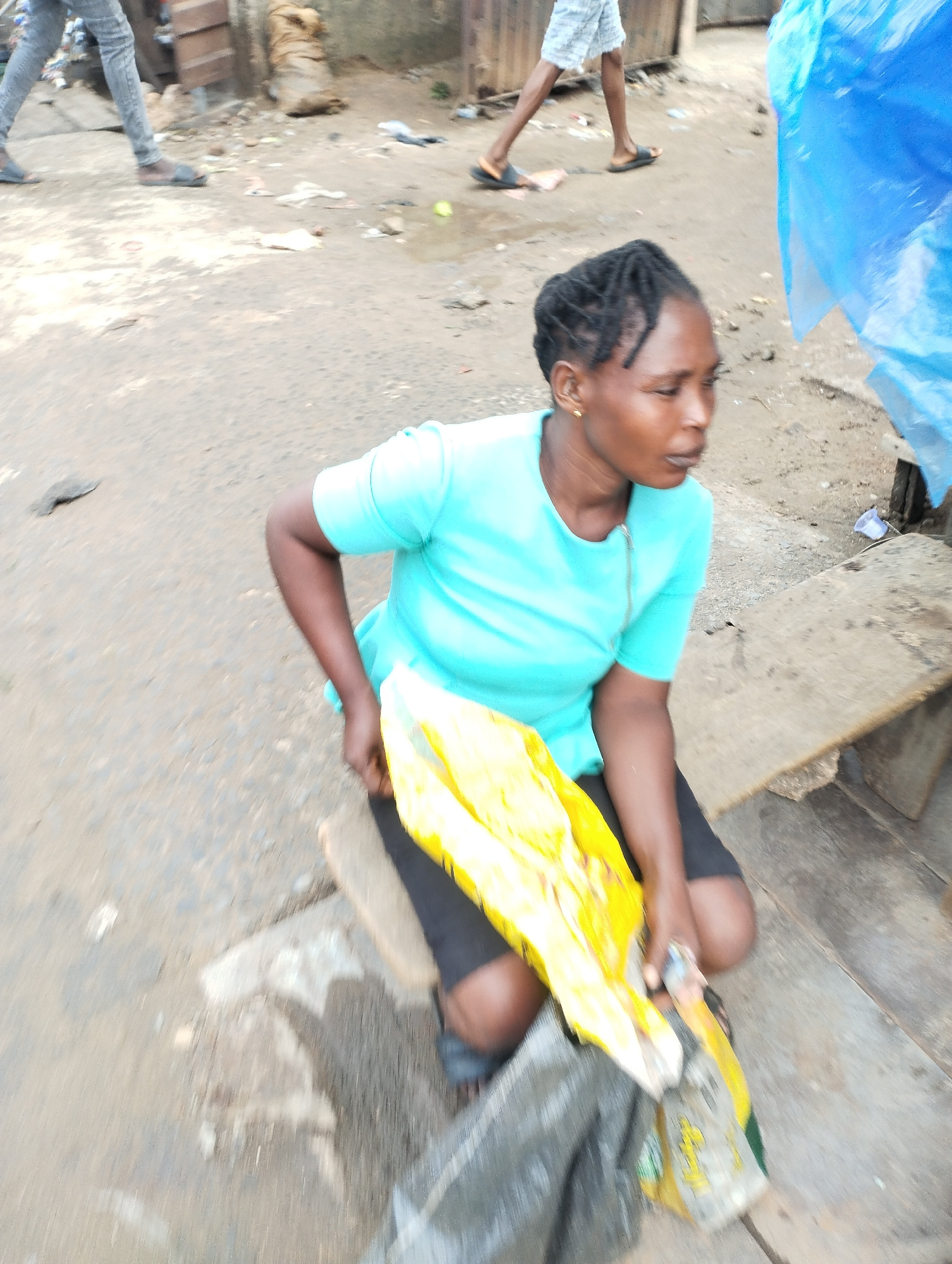 In Fegge, Nigeria, a woman with braided hair and wearing a light blue shirt and black shorts is kneeling on a low stool. She is holding a yellow plastic bag, partially obscured by a black bag. The groβ¦read more