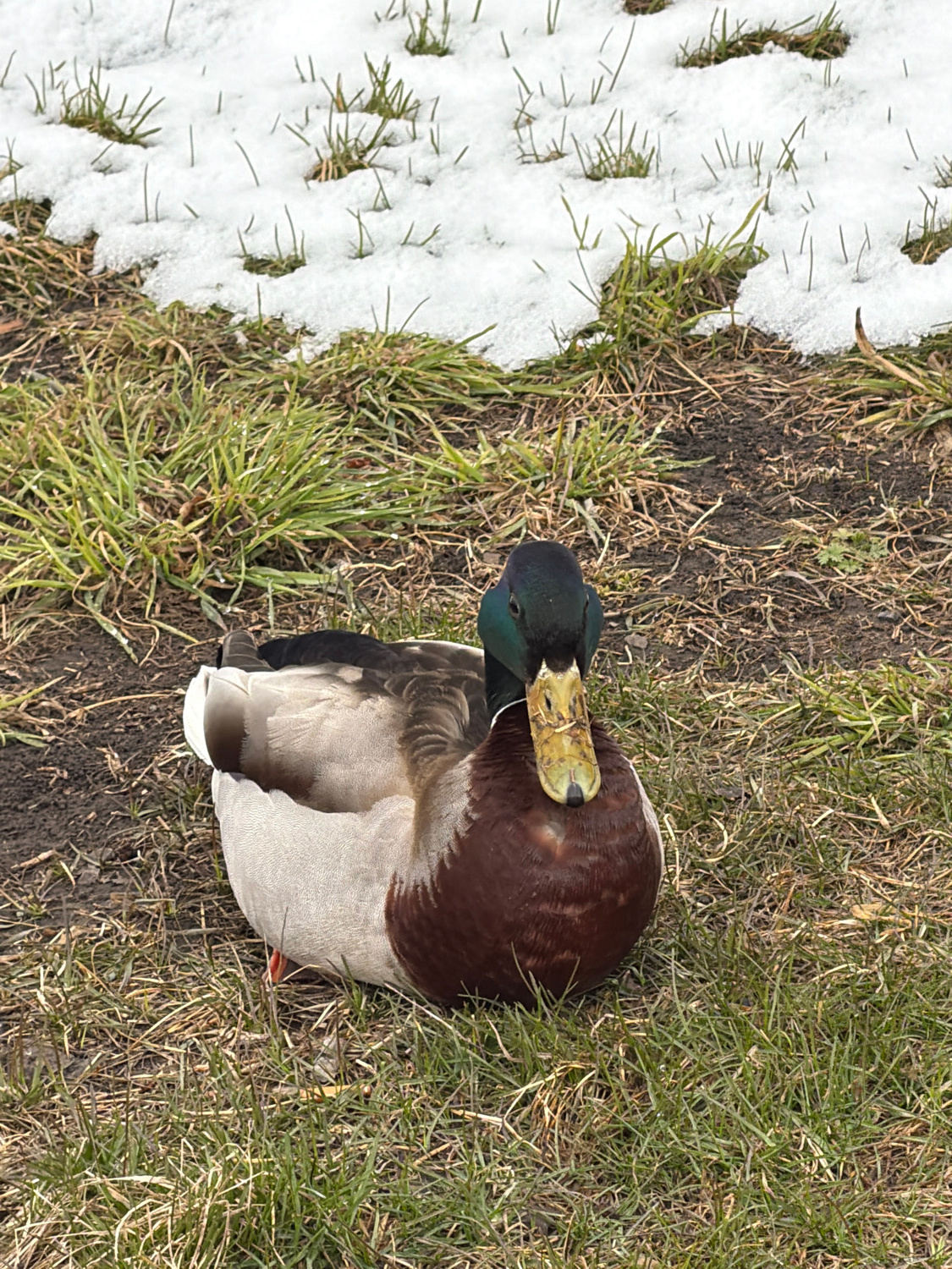 The image displays a single male mallard duck resting or preening on the ground. The duck is positioned with its body facing right, and its head turned sharply to the left, with its bright yellow-oran…read more