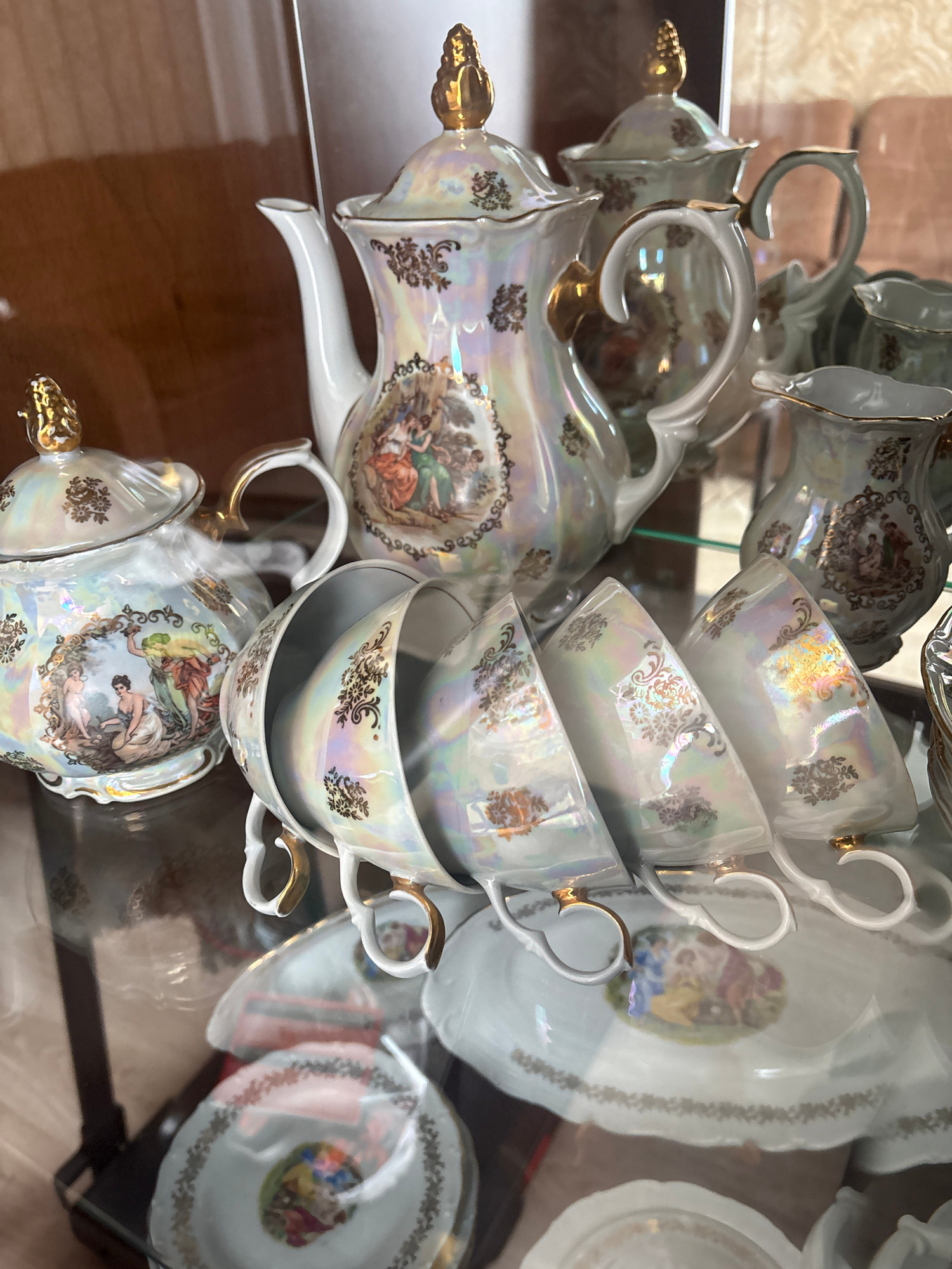 An ornate, vintage tea set, likely made of porcelain or ceramic, is the central subject of this indoor photograph. The set features a lustrous, iridescent pearlescent glaze, giving it a shimmering qua…read more