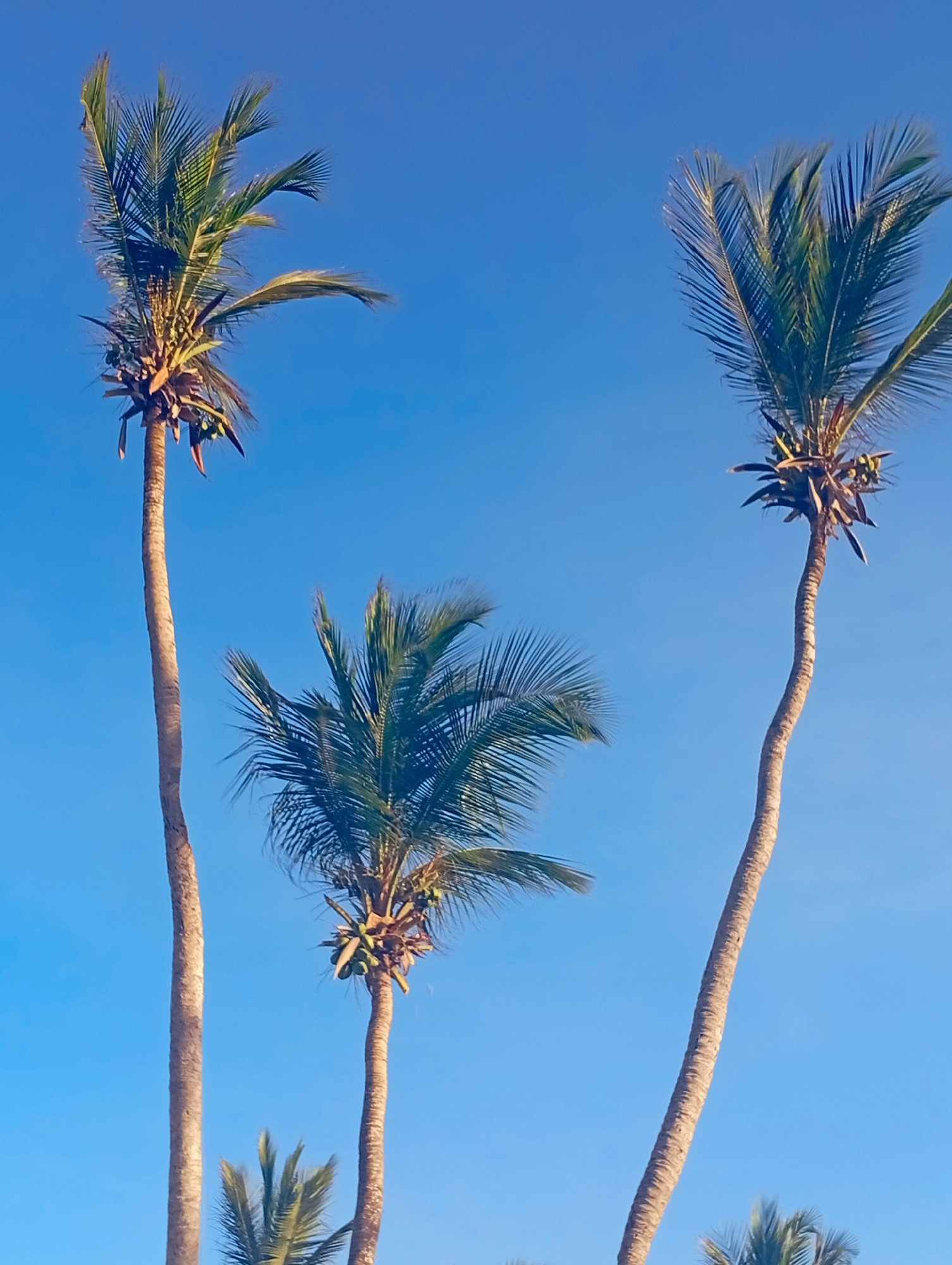 The image displays a clear blue sky over Playa El Agua, Venezuela, featuring five palm trees. Three prominent palm trees dominate the frame, with parts of two additional palm trees visible at the bottom. The palm tree on the left is tall and straight, with green fronds and visible clusters of green coconuts at its crown. The palm tree on the right is equally tall but exhibits a noticeable curve in its trunk, also topped with green fronds and green coconuts. A third, shorter palm tree is situated centrally, below the other two, also bearing green fronds and coconuts. The trunks of all visible palm trees are light brown. The sky is uniformly clear and bright blue, indicating daylight. No people or human structures are present. | Open Wire