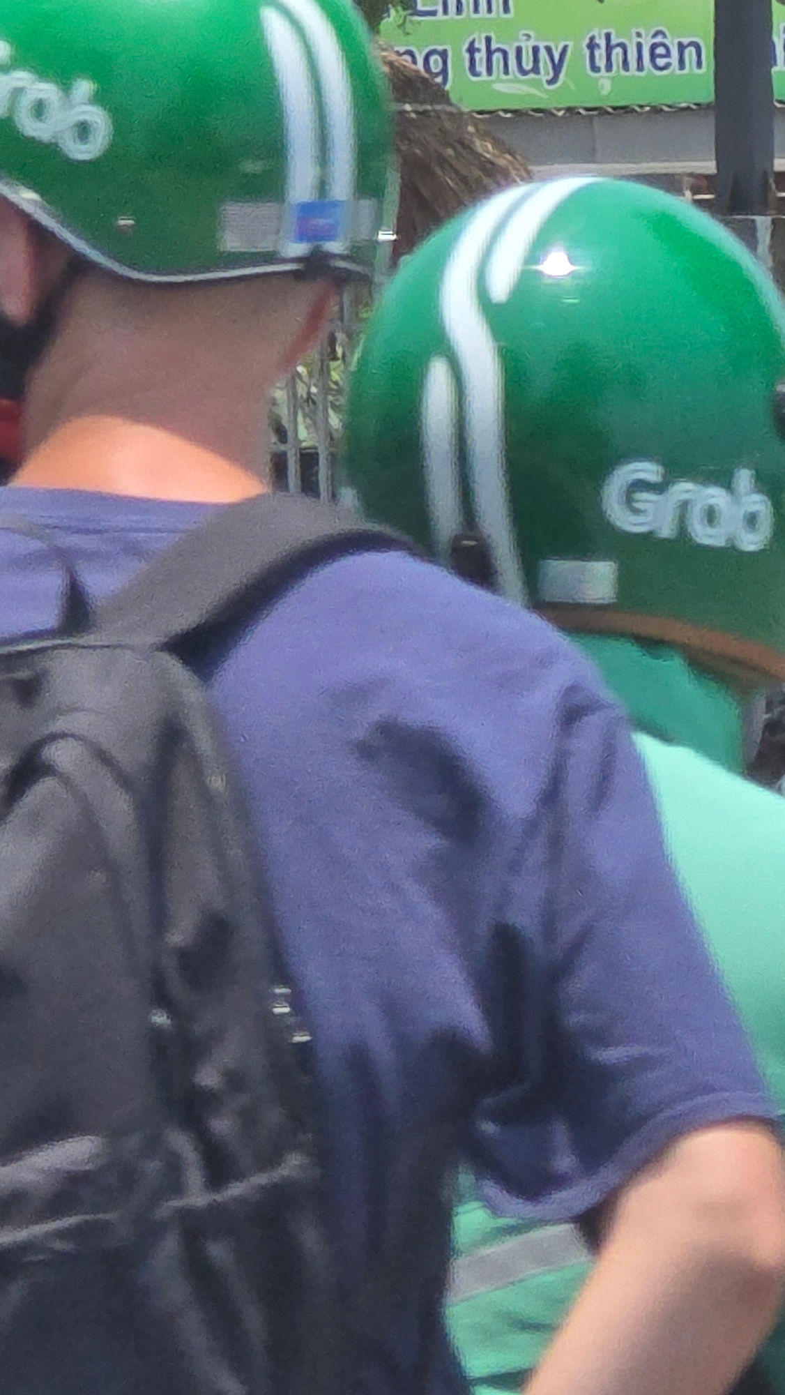 Two individuals are visible in the image, both wearing green motorcycle helmets branded with the word "Grab," indicating they are likely operating ride-hailing services. The visible individual is wear…read more