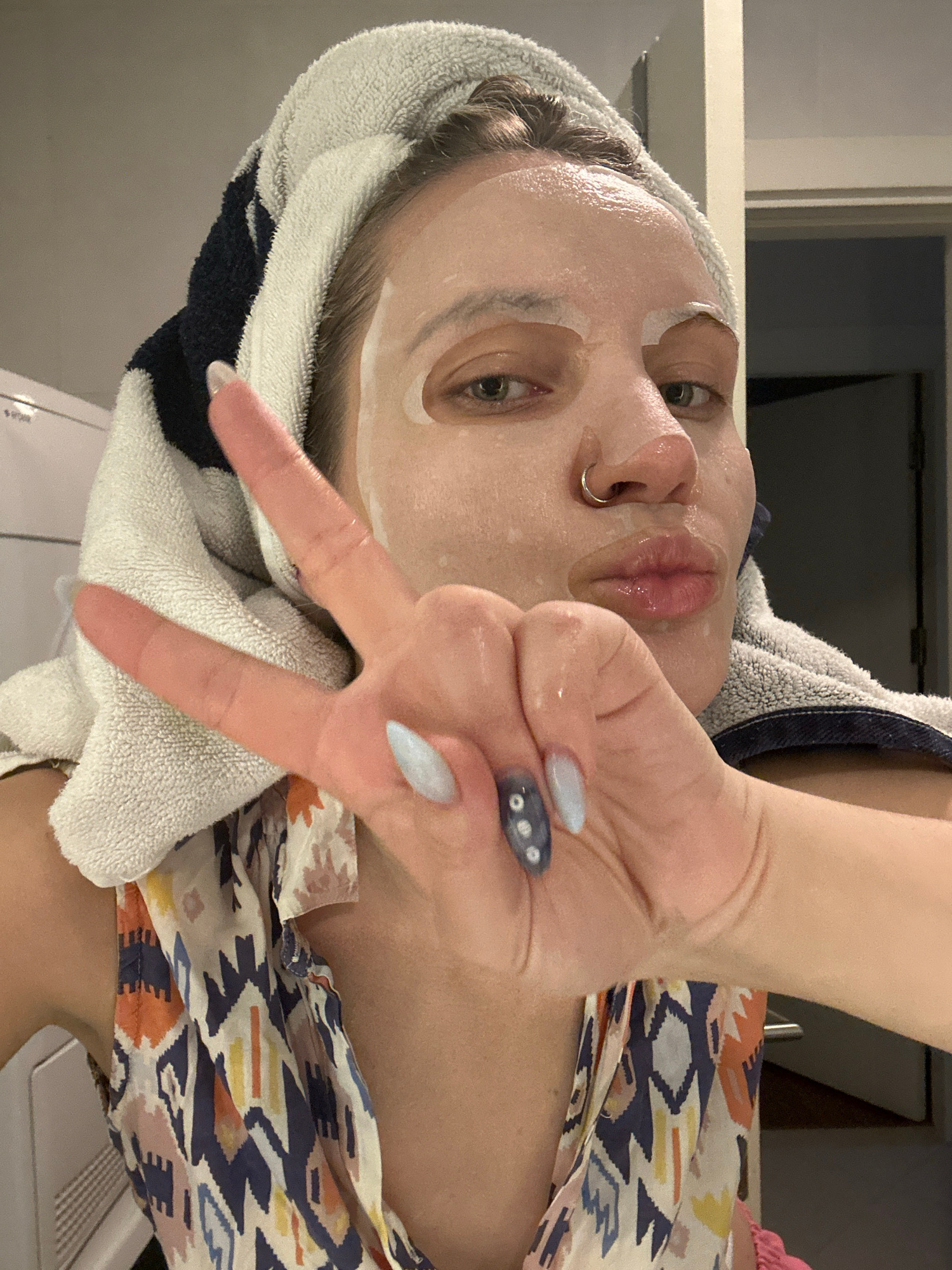 A woman with a face mask and a towel on her head makes a peace sign with her hand. She is wearing a printed top. The location appears to be a bathroom, potentially in a private residence. It is impossβ¦read more