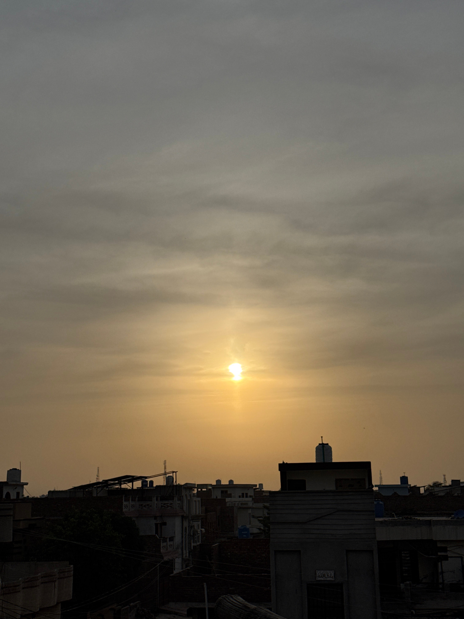 The image depicts a hazy or smoggy cityscape under a bright sun, likely at sunrise or sunset. The location is likely in Multan, Pakistan, judging by the architectural style of the buildings. The sky i…read more