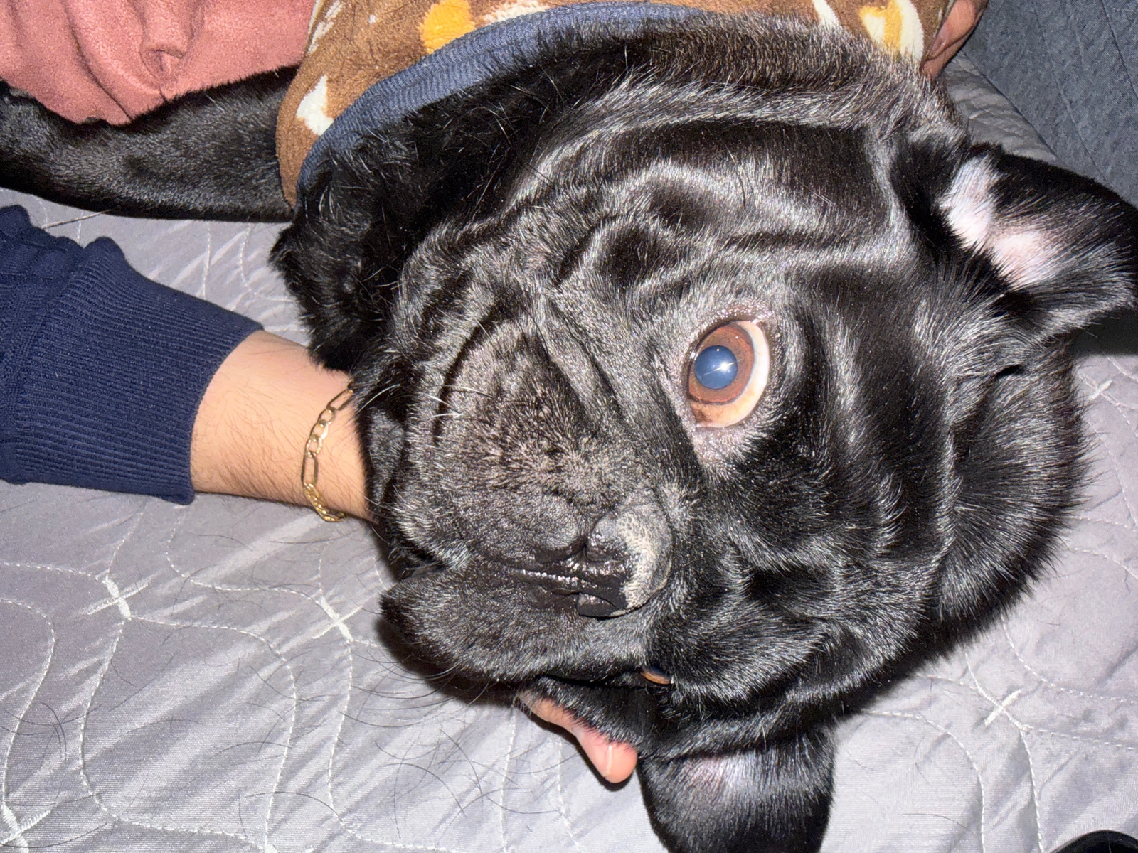 The image depicts a close-up, high-angle view of a black pug dog being held or petted by a human hand, set in an indoor environment in San Bernardino Tlaxcalancingo, Mexico. The dog, positioned somewhβ¦read more