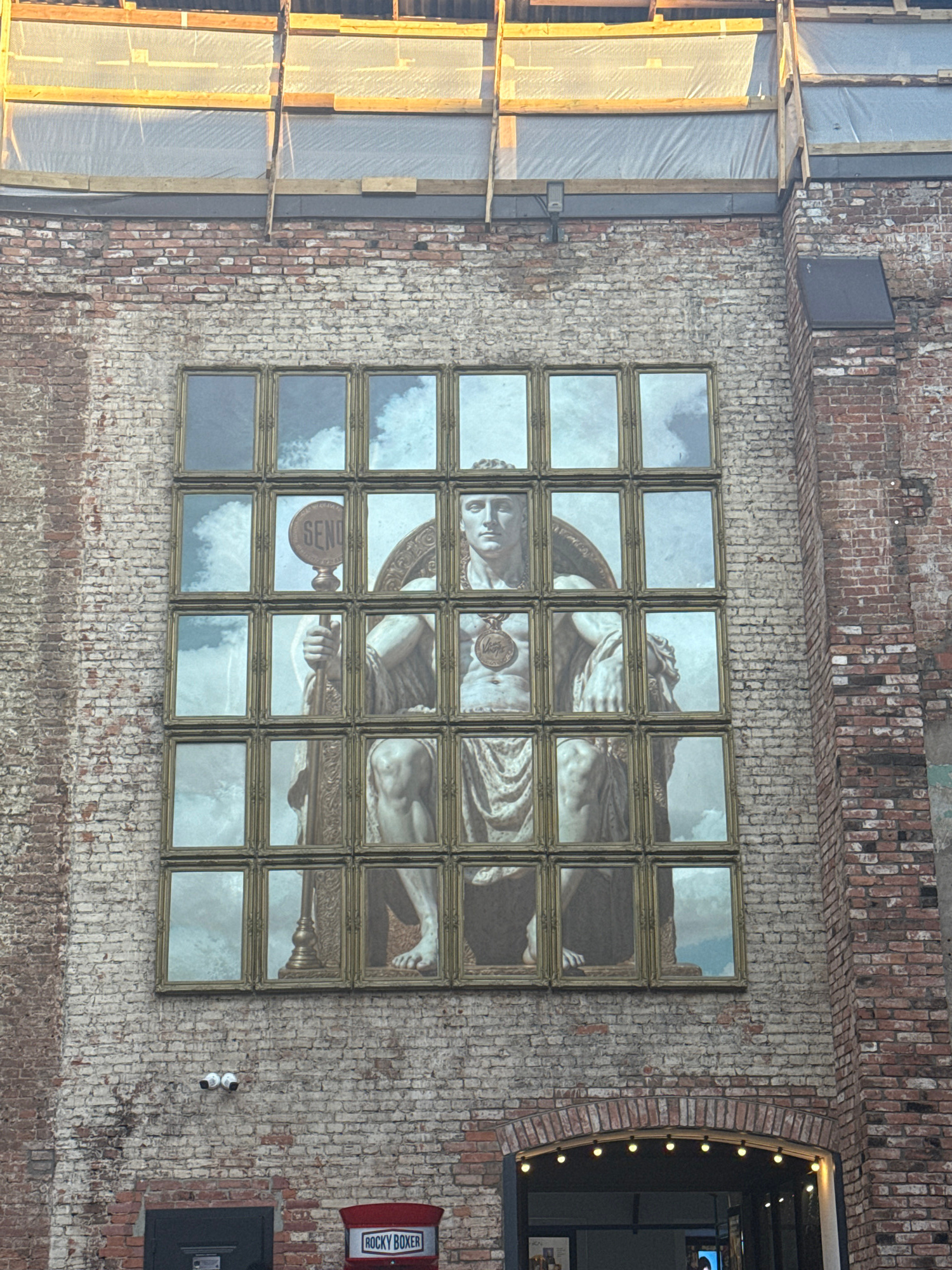 The image depicts a brick building exterior. A square grid of 20 framed pictures displaying a classical statue fragment is mounted on the brick wall. Adjacent to the grid is an arched doorway with lig…read more