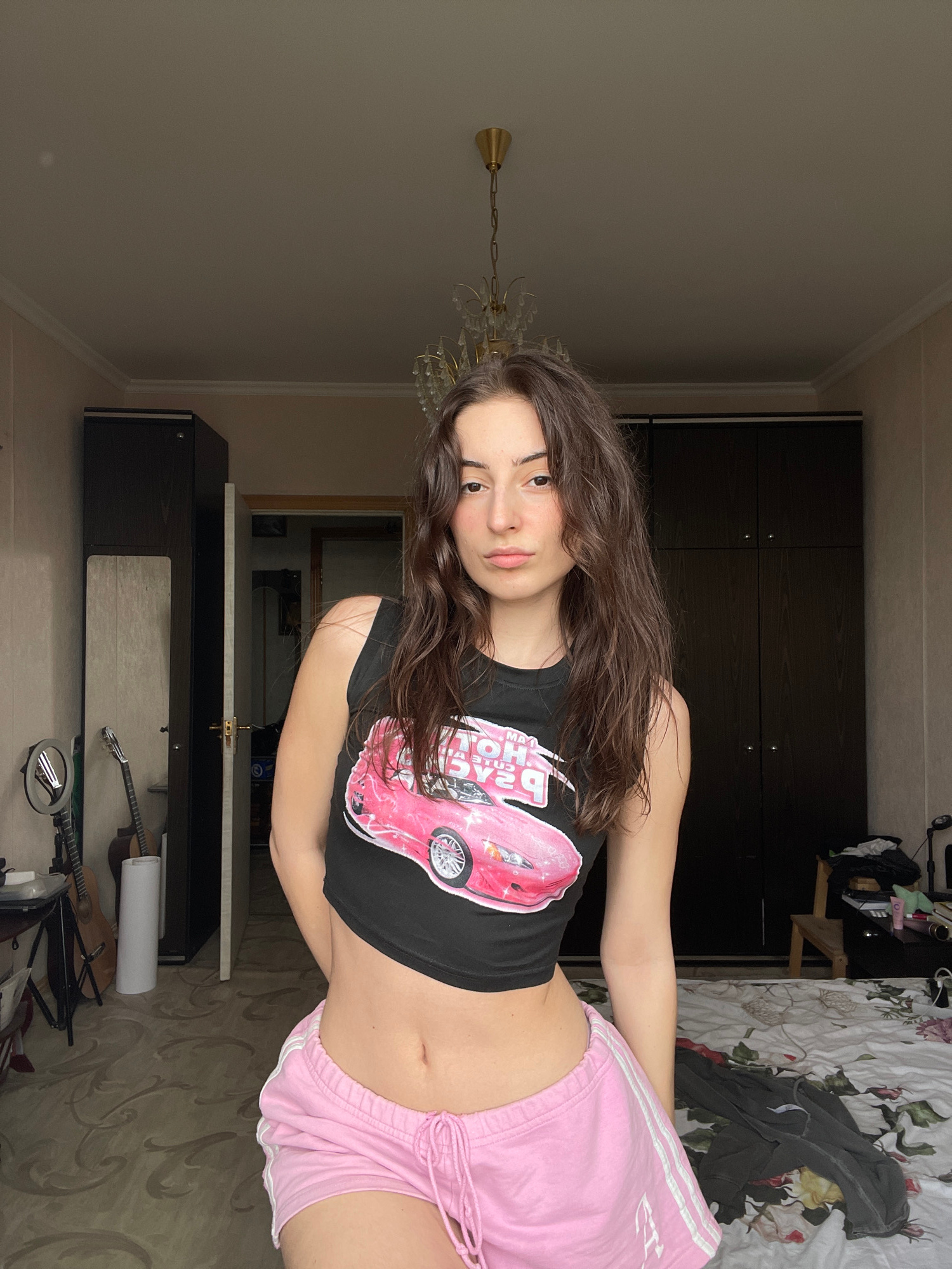 The image depicts a young woman with long, dark hair, wearing a black crop top with a pink car design and pink shorts. She is indoors, likely in a bedroom or living space, as suggested by the presence…read more