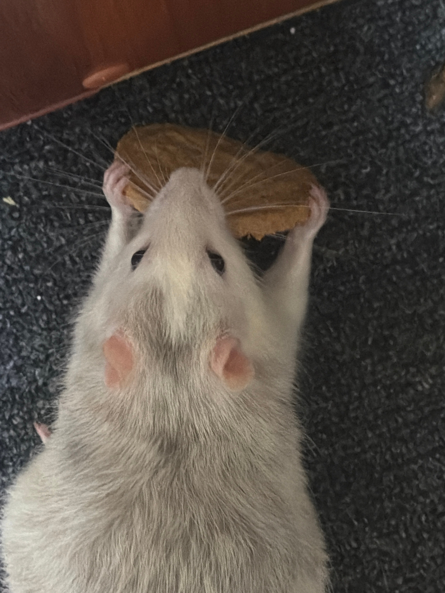 A gray and white rat is shown from an overhead perspective, holding a piece of bread in its paws, appearing to consume it. The rat is on a dark gray, textured surface, possibly carpeting. A portion of…read more