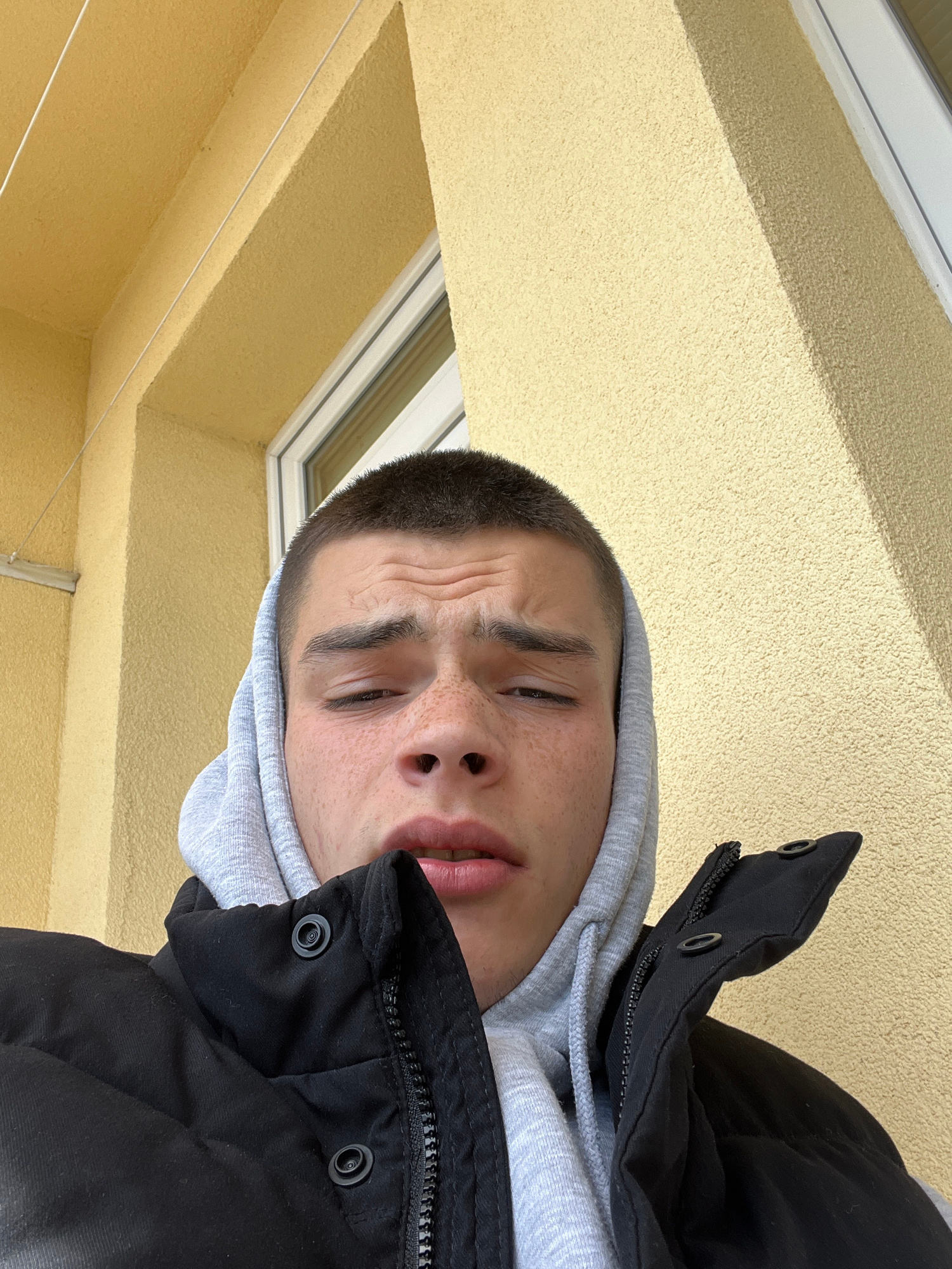 A close-up, low-angle view shows a person wearing a gray hooded sweatshirt under a black jacket. The person's face is partially visible, revealing freckles. The background consists of a yellow texture…read more