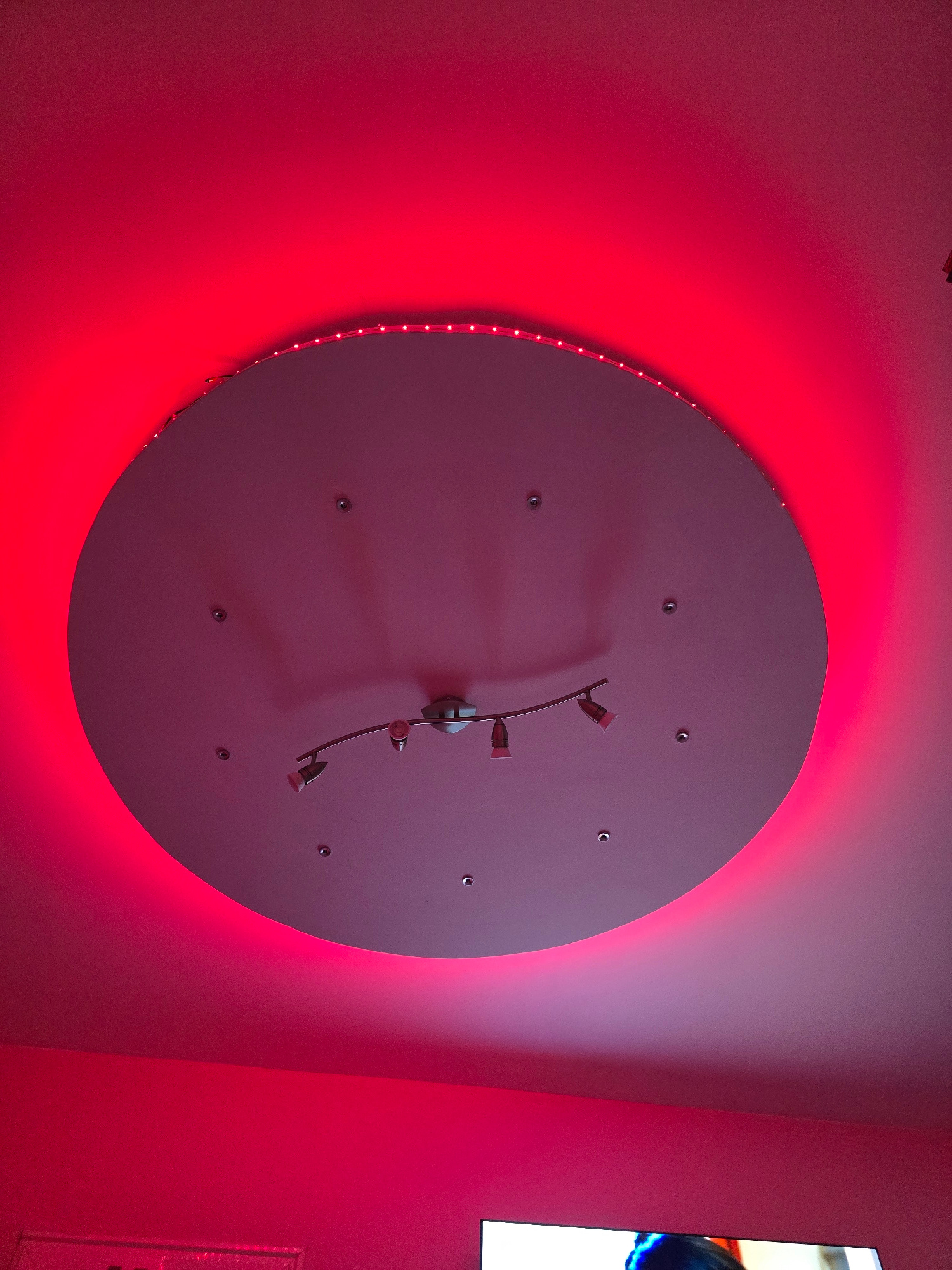 The image shows a circular object mounted on a wall, lit with red LED lights around its perimeter, casting a red glow on the wall around it. The object appears to be a light fixture, with smaller spot…read more