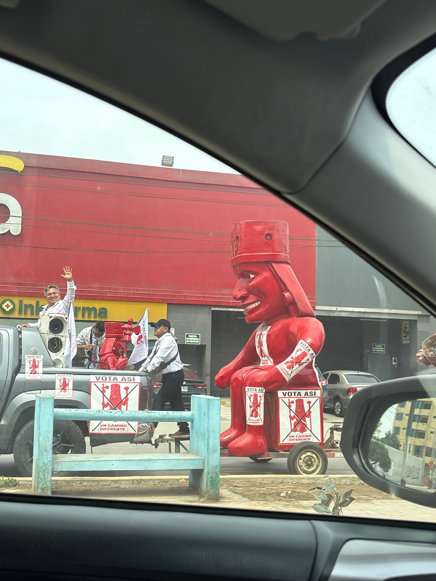 The image shows a political parade in La Perla, Peru. A large red figure, with a head resembling a piston and a cartoonish face, is being transported on a wheeled platform behind a pickup truck. Banne…read more