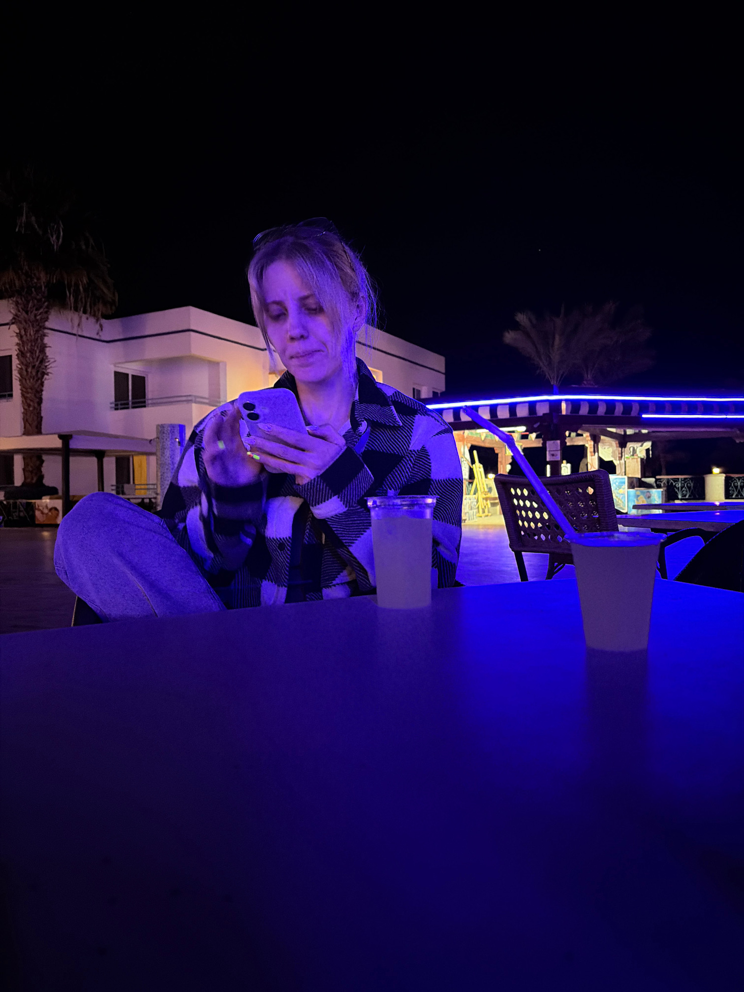 A young woman is sitting at a table in Sharm El Sheikh, Egypt at night, using a smartphone to capture a picture of her drink. She's dressed in a plaid jacket and jeans. The background shows illuminate…read more