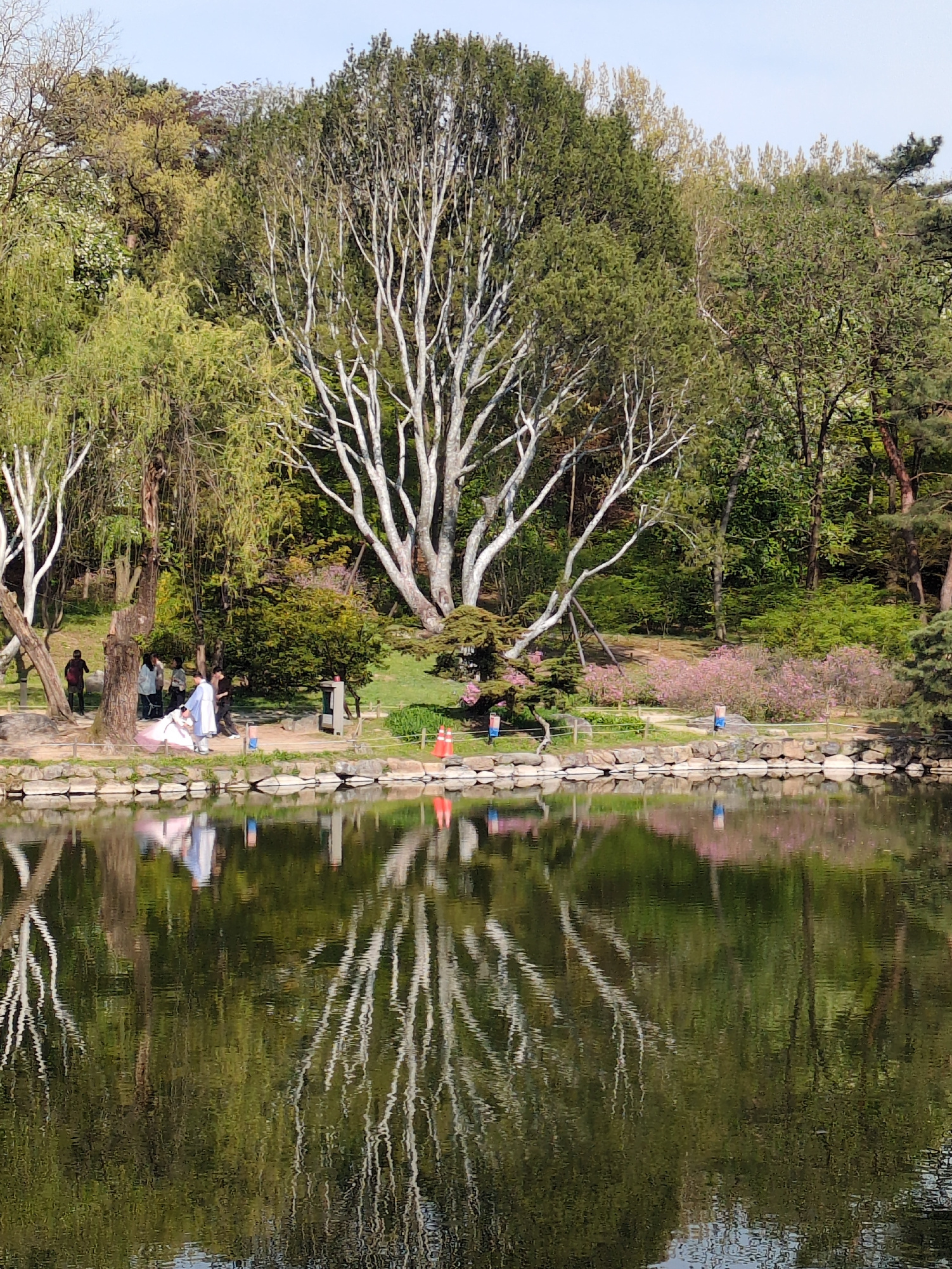 The image depicts a scene in Seoul, South Korea, featuring a body of water reflecting the surrounding landscape. The reflection dominates the right half of the image, showing the water's rippled surfa…read more