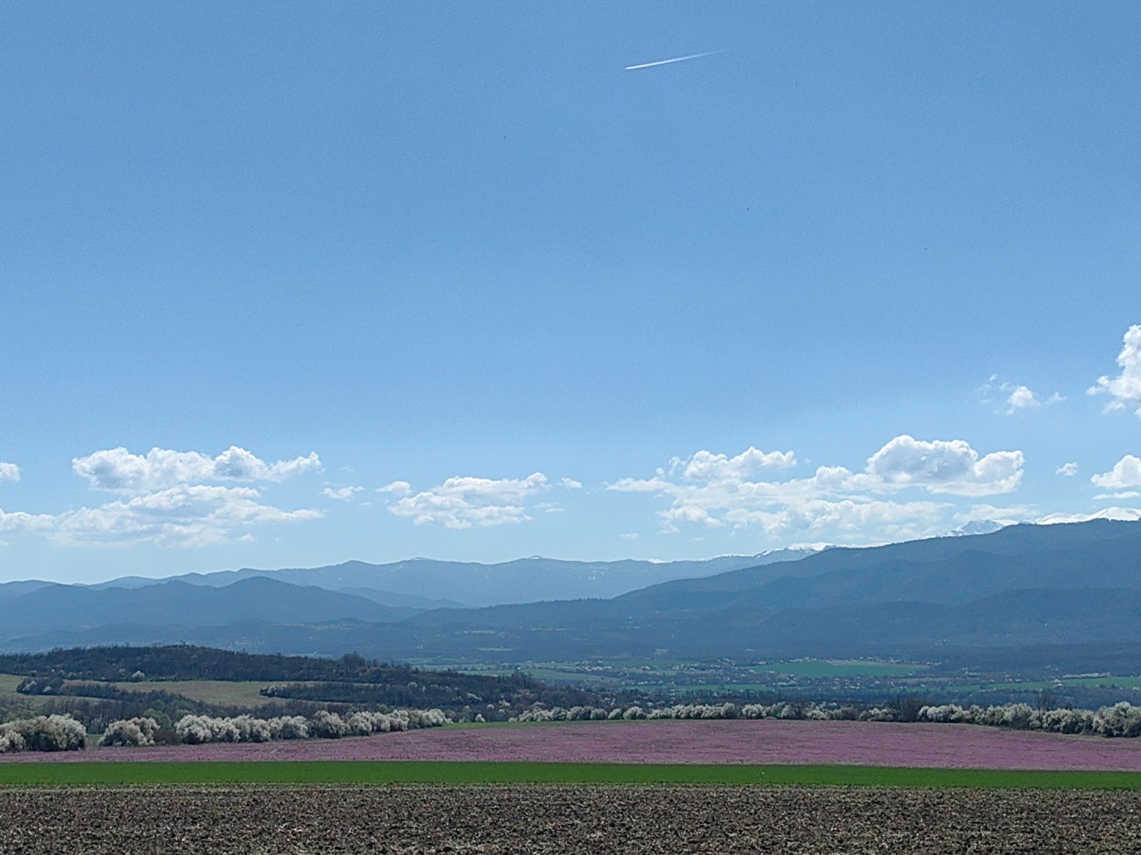 The image depicts a landscape near the city of Shumata, Bulgaria. The foreground consists of ploughed soil followed by a green field and a purple field. A line of flowering white trees separates the p…read more