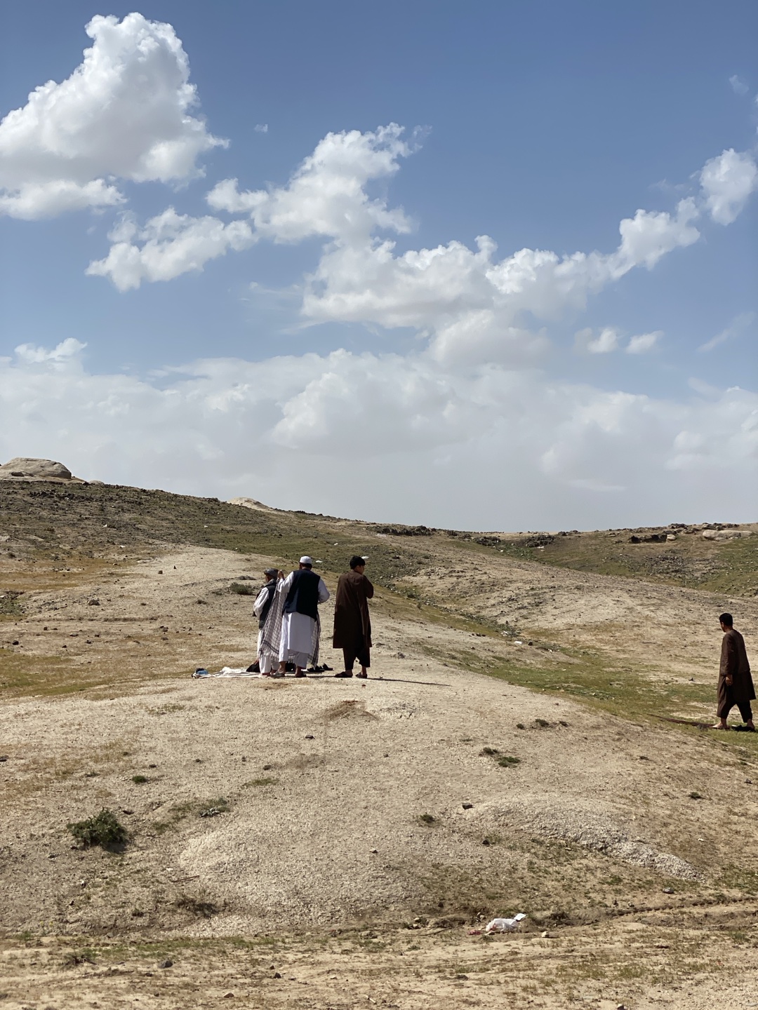 The image shows a group of men outdoors in what appears to be a hilly, arid landscape near Abdol Ahadkhan Kariz, Afghanistan. The sky is blue with scattered white clouds. In the center-left of the fraβ¦read more