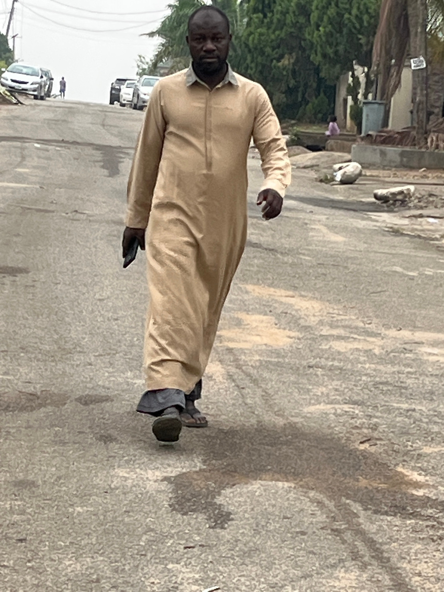 A middle-aged man wearing a traditional tan-colored robe and sandals walks on an asphalt road in Abuja, Nigeria. He is holding a black smartphone in his left hand. Several vehicles, including cars and…read more