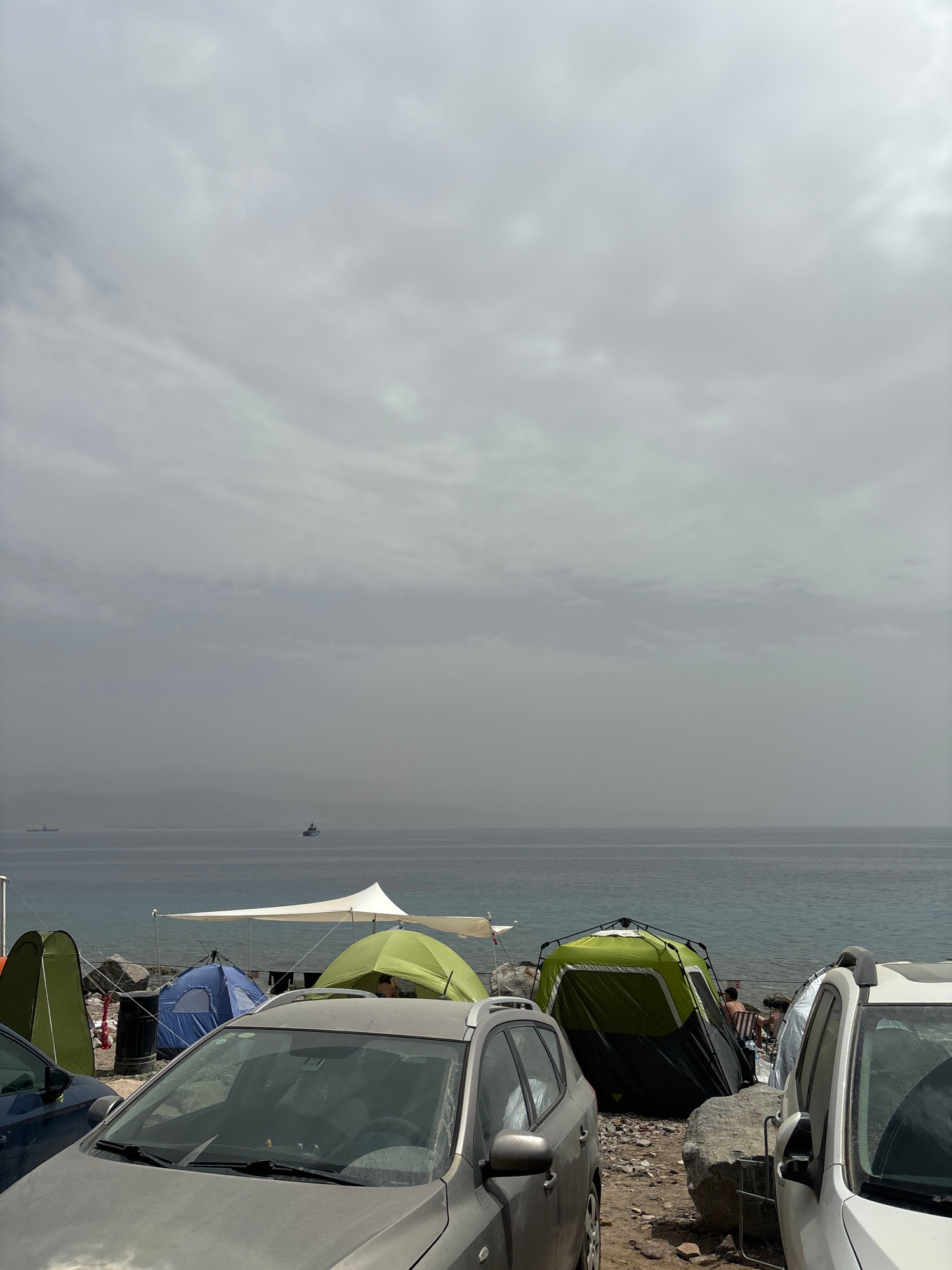 The image depicts a camping site on the shore of the Red Sea in Eilat, Israel. Several cars are parked alongside a rocky beach, adjacent to tents and sunshades. The tents are various colors including…read more