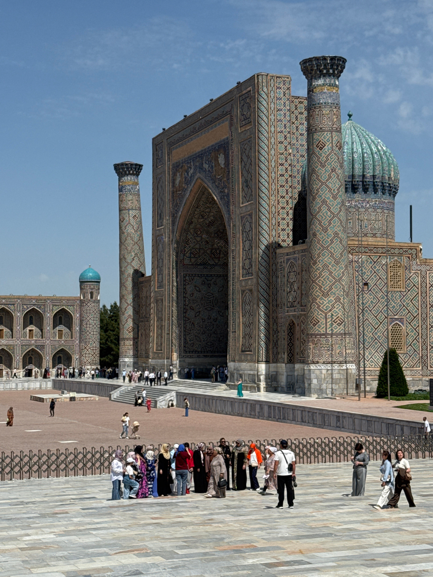 The image shows the facade of a large, ornate building with a tall, decorated column, likely a mosque or other religious structure, standing at an angle. The facade features intricate tilework with ge…read more