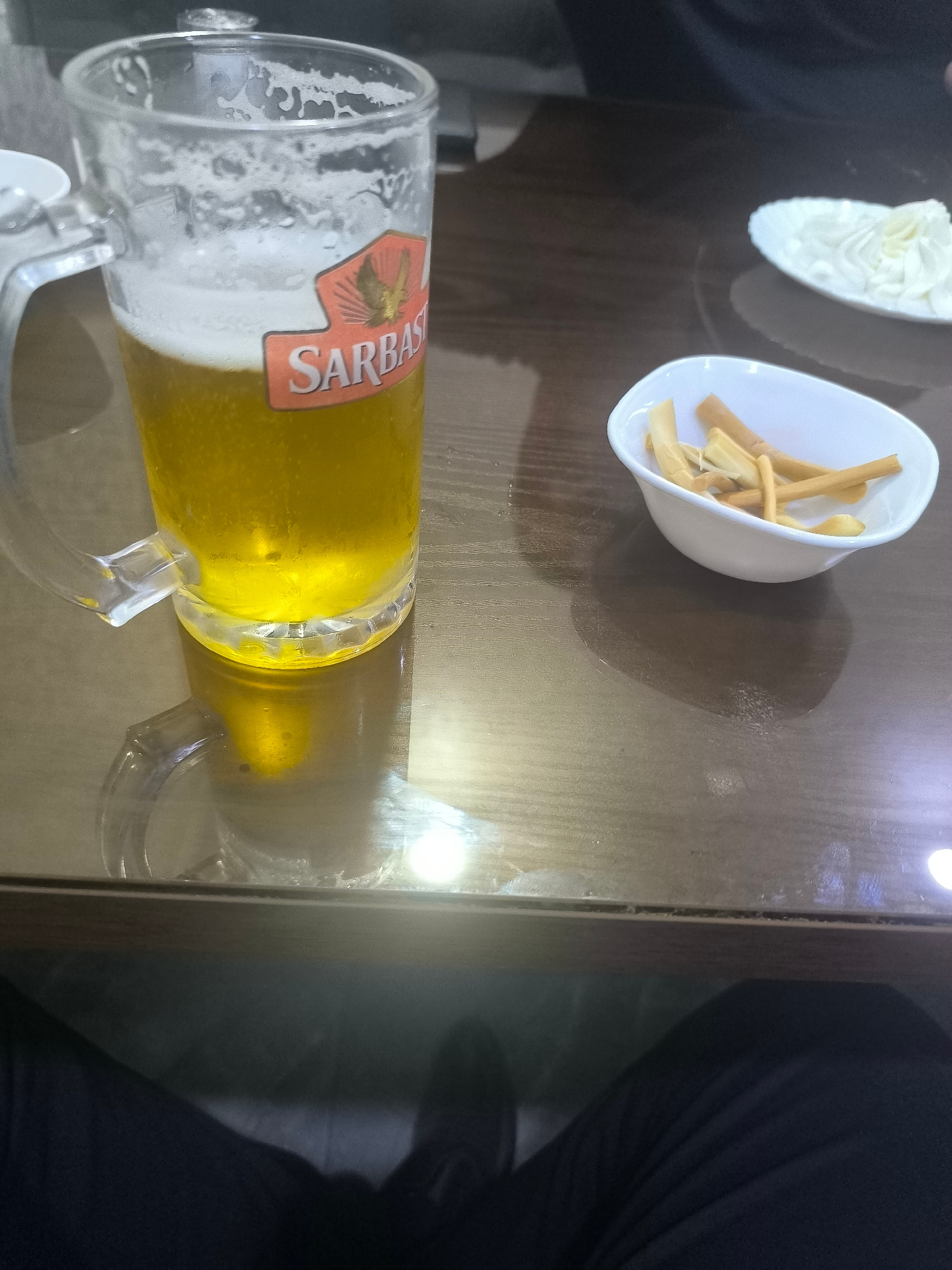 A table setting in Jizzakh, Uzbekistan features a partially consumed glass mug of Sarbast beer, a small white bowl containing dried cheese sticks, and a small white plate with a dollop of whipped crea…read more