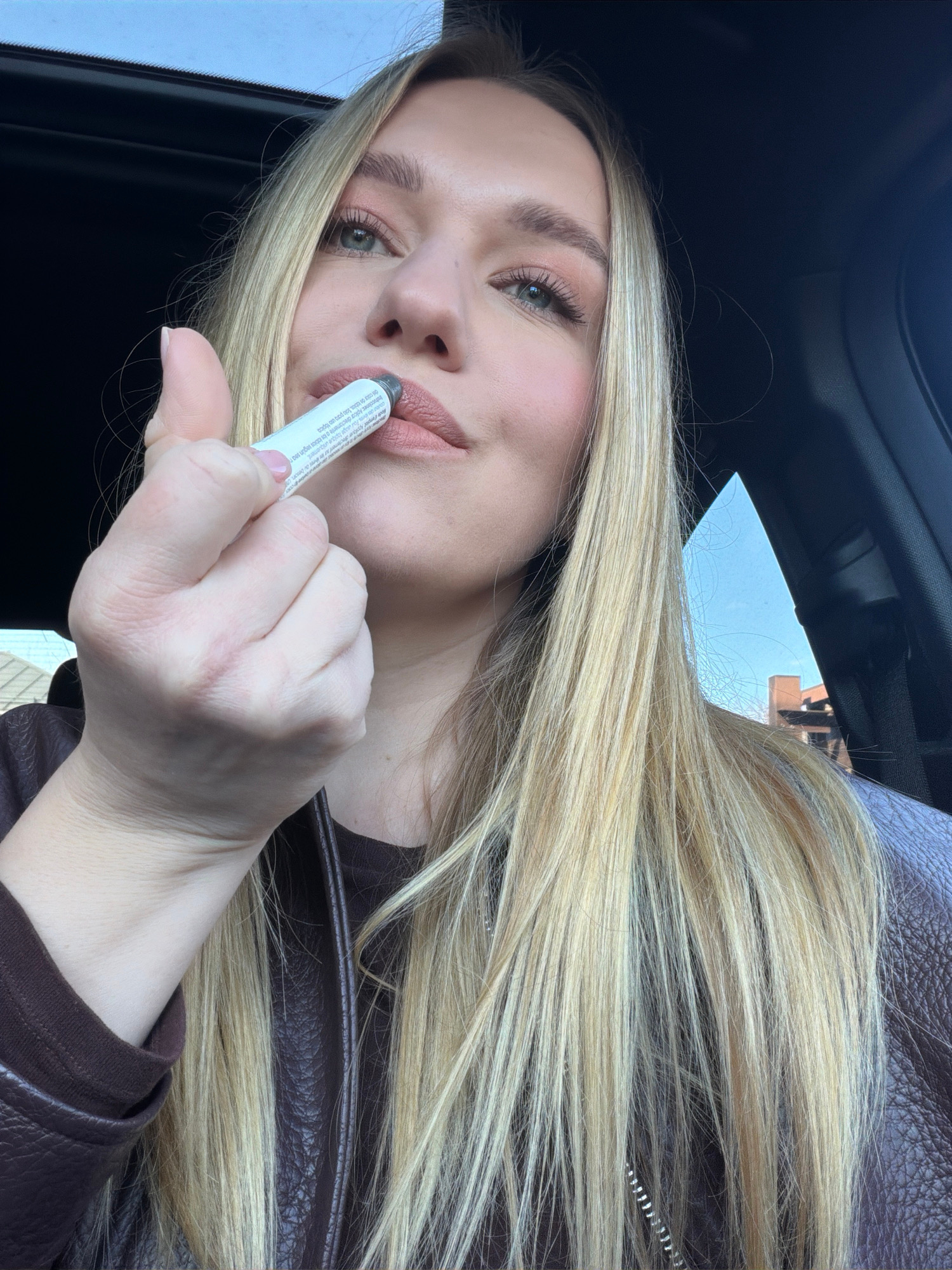 A fair-skinned young woman with long, straight blonde hair is captured in a close-up, sideways-oriented shot, appearing to be inside a vehicle. She is wearing a dark brown leather jacket over a darker…read more