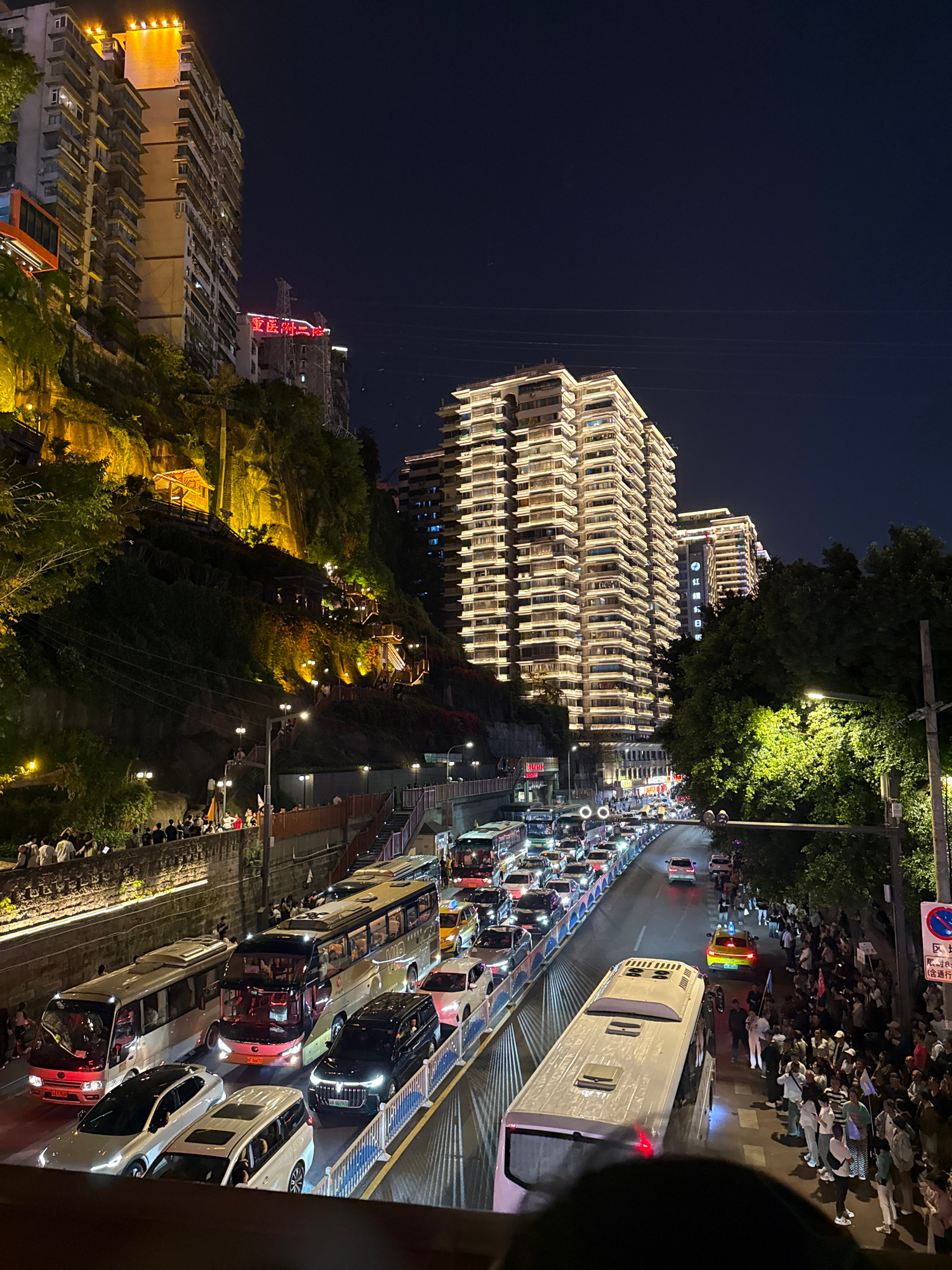 This night-time image depicts a vibrant urban scene in Yuzhong District, China, characterized by bright lights, dense traffic, and a large crowd of onlookers. In the background, a dark, clear night s…read more